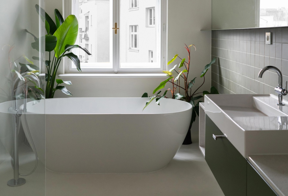 Ke koupelně se nakonec připojil i zbytek bytu. Kuchyň se stala příjemným experimentem pro mladý pár. Prostor pro jídelní stůl definují parkety, prostor pro vaření dlažba. Černá linka s kovovými posuvnými dvířky, deska z nerezu. Dvířka dělají kuchyň v pohybu. „Něco je vidět, něco ne a každý den je to trošku jinak. Zbytek bytu doplňuje zrekonstruovaná chodba s velkým kruhovým zrcadlem, skříní a stejnou dlažbou, jako v kuchyni, ale jiné barvy,“ uzavírá architektka.