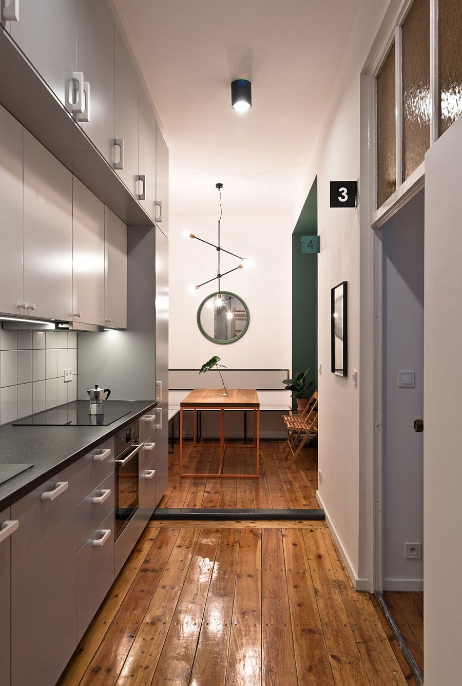 Studentský nájemní byt najdeme v budově z 30. let v polské Poznani. Architekti Agnieszka Owsiany a Adam Wiercinski dostali za úkol interiér o ploše 83 metrů čtverečních elegantně rozdělit na čtyři samostatné ložnice a společný jídelní prostor a kuchyň. Z dlouhé chodby vejdete do jednotlivých ložnic, na jednom konci bytu je společná koupelna a toaleta, na druhém kuchyň a jídelna. Ačkoli se zdá plán jednoduchý, právě v tom je jeho síla. Efektní design poskytuje studentům potřebné soukromí. Architekti stáli před rozhodnutím, jestli jednotlivé místnosti zmenšit a vytvořit společný obývací pokoj. Raději se rozhodli pro větší ložnice s dostatečným úložným prostorem. Pro trávení společného času bohatě stačí jídelní kout s praktickými lavicemi a skládacími židlemi.