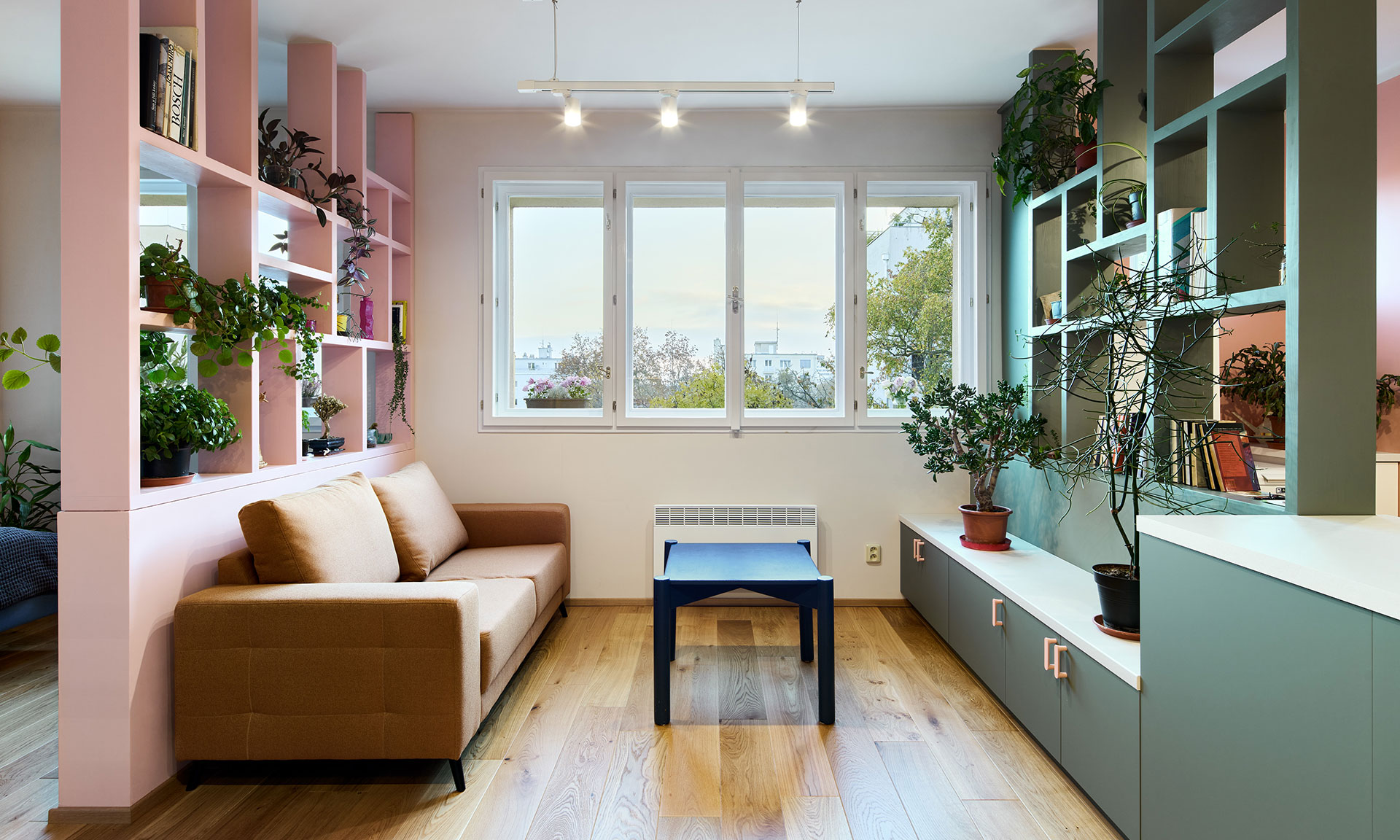 Dalším typickým krokem při rekonstrukcích je všechno původní vybavení vyvézt na skládku. „Nicméně takový přístup se nám nejevil zrovna ideální. Podařilo se nám zachovat původní dveře s charakteristickým prosklením žluté barvy, byť jsme je v rámci bytu všechny přesunuli na novou pozici. Také jsme využili původní vodovodní kohoutky, ke kterým se pouze dokoupila sprchová baterie stejného designu. I když se klasický nástěnný kohoutek dnes používá zřídka a najít vhodné umyvadlo bez otvoru na stojánkovou baterii byl oříšek, tak i řešení těchto detailů ve výsledku stálo za to a dodaly interiéru osobitý charakter. Součástí rekonstrukce byla samozřejmě kompletní obnova technických instalací. Díky změnám v rozvodech se nám podařilo odstranit zvýšenou podlahu koupelny a vyřešit bezbariérový vstup do walk-in sprchy. Do sprchového koutu jsme navíc umístili praktické sedátko. Celá koupelna měla původně dispozici těžko využitelné úzké nudle, ale to jsme tak nemohli nechat. Zkrátili jsme ji, část připojili k předsíni a využili jako šatní komoru.“ Dveře do koupelny architekti přesunuli do jejího středu a i díky tomu se do ní vešlo vše potřebné, přestože ji trochu zmenšili. Menší výměru koupelny vykompenzovali velkoformátovým zrcadlem, které ji opticky zdvojnásobuje. Ve velkém zrcadle se také odráží průhled celým bytem s paravány. Nově celým prostorem skrz na skrz proniká velké množství denního světla, přestože jednotlivé funkční části jsou jasně oddělené barevnými paravány.