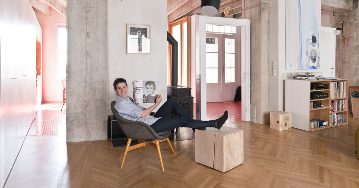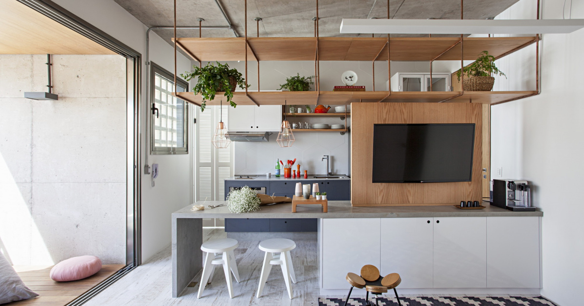 „Nejprve jsme navrhli otevřený, ale tematicky rozdělený prostor pro domácí činnosti majitelky: jóga, tanec, vaření. Zkombinovali jsme proto kuchyň, obývací pokoj a balkon, ale díky různým texturám a materiálům vznikly poměrně jasně dané tematické zóny,“ vysvětlují autoři projektu. Kuchyně se nachází v centrální části bytu. Žulový kuchyňský ostrůvek osvětlují hravé žárovky, které rozbíjí jinak přísně stanovenou formu místnosti a jednoduché linie. Obývací prostor je téměř uměleckým dílem. Stěny jsou pokryty speciálním jílovým roztokem, aby získal požadovaný objem. Reliéf byl vytvořen při sušení, kdy materiál popraskal a vznikly jedinečné vzory. Interiér tak připomíná starodávné hliněné chatrče. Pozornost strhává lampa Ochi, které pochází z dílny Makhno Studio. „Veškerá svítidla vznikla v našem ateliéru a vychází z ukrajinské tradice. Trvalo nám několik měsíců, než jsme našli člověka, který by byl schopný pro nás tak veliká světla vytvořit. Nad kuchyňským ostrůvkem je sada čtyř džbánkových lamp, které byly speciálně vytvořeny pro tento byt.“ Prostor ložnice je také otevřený a propojený s koupelnou. Dělí je od sebe průsvitné dveře. „Jsem z bytu nadšená. Mé hosty fascinuje zejména hliněná jeskyně, protože je zkrátka neobvyklá a působivá. Pokud jde o mě, připadám si zde jako uprostřed divoké nedotčené přírody. Věřím, že současný ukrajinský styl má před sebou skvělou budoucnost,“ říká Anastasia, majitelka bytu.