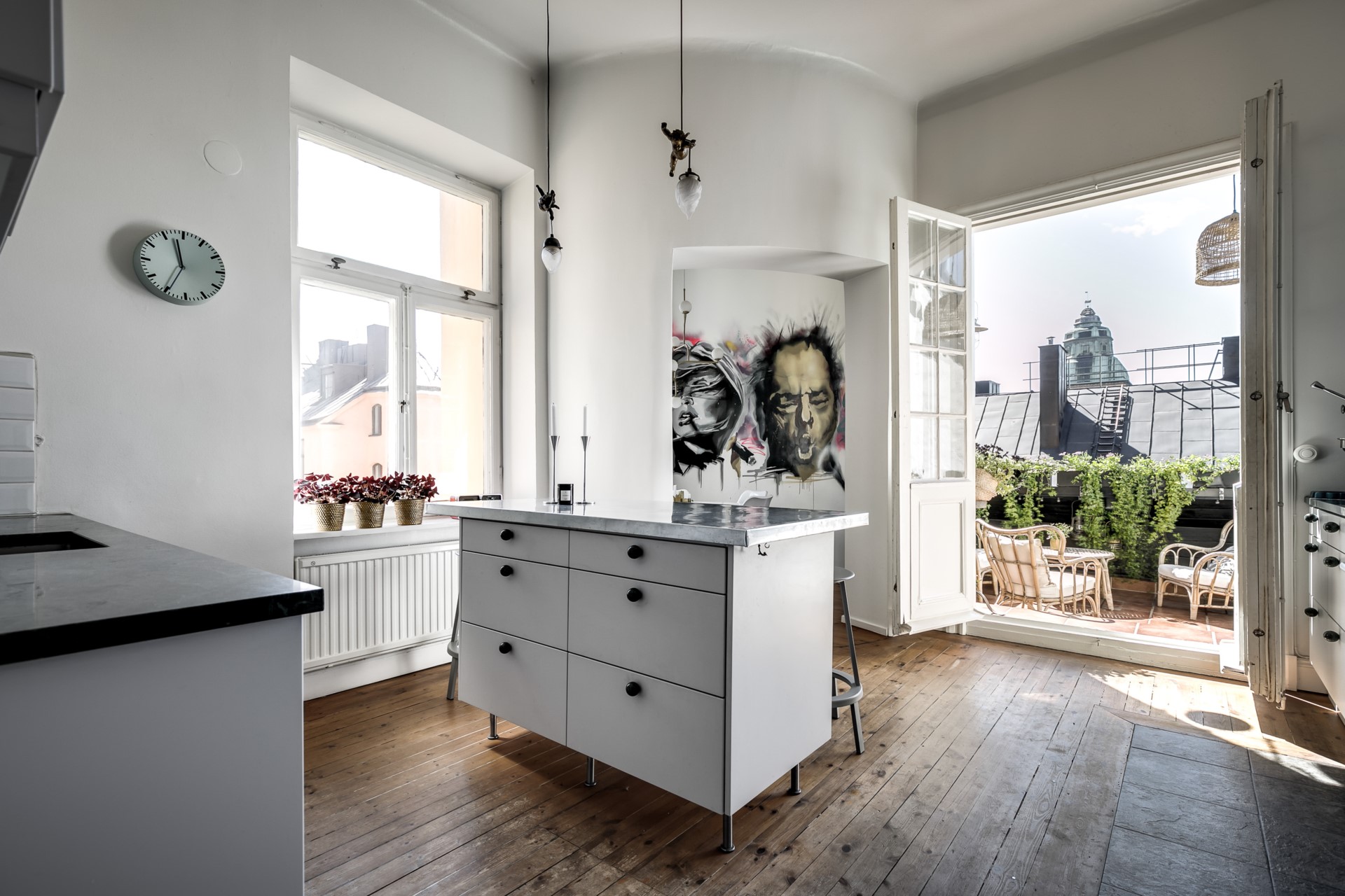 Do apartmánnu vstoupíte po točeném schodišti. Po levé straně se můžete vydat na již zmiňovaný balkon o ploše 5 m², nebo pokračovat dál halou s vestavěnými skříněmi. Z té vedou dveře do tří pokojů, z nichž jsou dva průchozí a ten zbylý neprůchozí, se kromě dokonalého soukromí a krásného krbu, pyšní vlastním balkonem. Hlavní společný obývací prostor najdete v samotném srdci bytu. Může se zdát nepraktické, že přímo nenavazuje na velikou kuchyň, to ale nevadí. Právě díky této atypické vzdálenosti má atmosféru luxusního salonku s barem a koženými pohodlnými sedačkami. Kuchyň je zcela moderní v jednoduchém bílém dekoru s nerezovou pracovní deskou a nerezovými spotřebiči. Posnídat můžete u praktického ostrůvku nebo se odebrat do jídelní části, která je v kruhovém výklenku, kde bylo dřív schodiště. Překvapí vás ryze moderní kresby na kulatých zdech v duchu klasického street artu. Hned vedle vchodu do tohoto jídelního úkrytu můžete vejít na jedenáctimetrovou terasu, kde nechybí ratanové posezení a gril. Terasa je pocelý den zalitá sluncem a pyšní se výhledem na radniční věž. Byt je ideální pro pětičlennou rodinu, ale jeho dispozice jsou natolik variabilní, že by ze něj šly vytvořit i dvě bytové jednotky.
