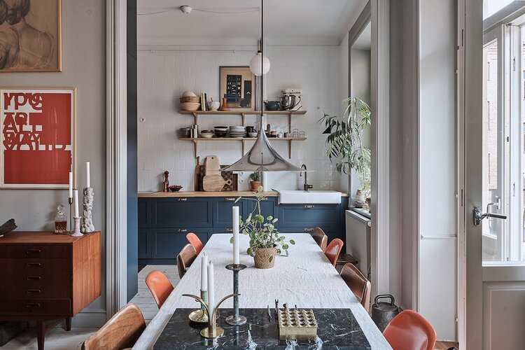 Byt byl před pár lety kompletně zrekonstruovaný, přesto si zanechal svou fascinující atmosféru. Tu podtrhuje dřevěná podlaha, výrazná výmalba a štukované vysoké stropy. Moderní kuchyně byla vybraná v lehce rustikálním stylu s modrými skříňkami, které doplňují zlaté úchyty. Dvoukřídlé dveře, které dřív oddělovaly kuchyň od obývacího pokoje, byly odstraněny a v místě průchodu dnes stojí veliký jídelní stůl. Za ním je možné vejít na balkón. Samotný obývací pokoj má stěny vymalované v lehce šedém nádechu. Kožený nábytek ladí se zajímavými obrazy na stěnách a spolu s pokojovkami navozují atmosféru minulých dekád. Modrá barva se opakuje v ložnici, kde byla nejen stěna, ale také veliké šatní skříně namalovány právě v tomto tmavém odstínu. Se stěnami ladí ikonická kostka postele značky Hästens, kterou doplňují skandinávské kožešiny a další nalezenci z nedalekých bleších trhů.