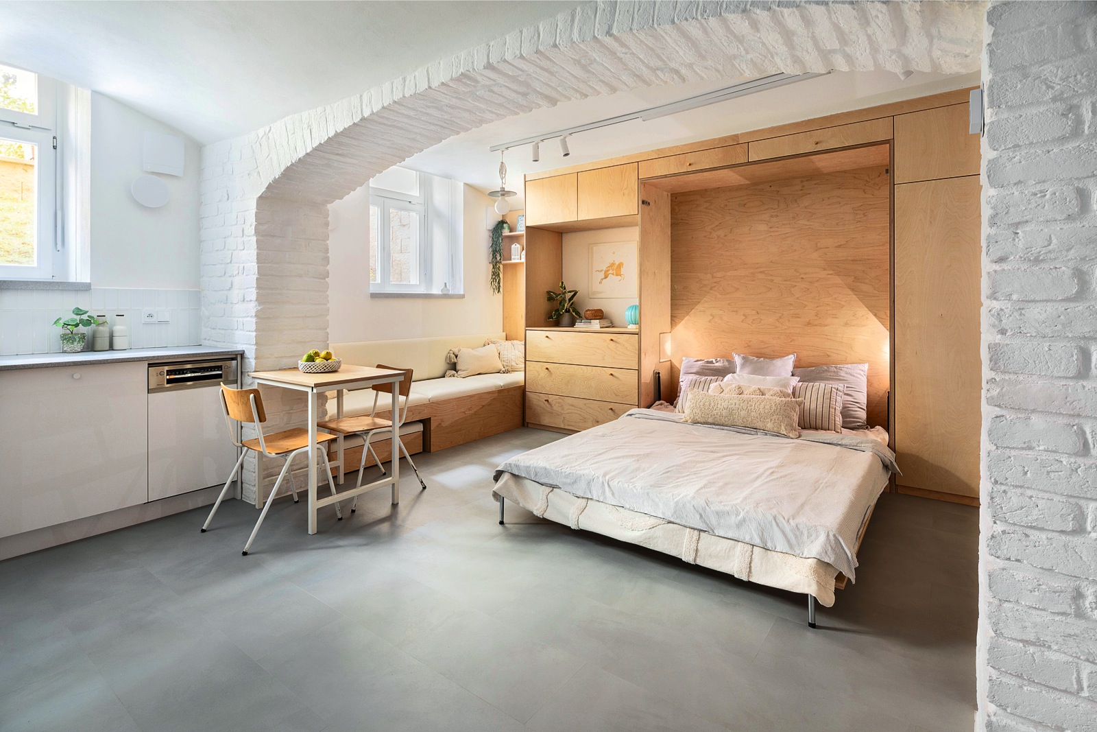 „Bylo to nákladné, ale nutné. Dosáhly jsme tak potřebné světlé výšky, která umožňuje pohodlný pohyb, odpočinek i práci, a zároveň jsme nechaly instalovat podlahové vytápění. To může temperovat prostor klidně i v teplejších měsících, což je skvělá prevence proti vlhkosti, stejně jako nepřetržitě fungující rekuperace,“ říká architektka. Do studia byly přivedené všechny technické sítě i voda, ale samozřejmě došlo na drobné úpravy. Elektroinstalaci nechaly Anny obnovit kompletně, aby odpovídala novému návrhu na rozmístění vypínačů, světel i zásuvek. „U prostorů tohoto typu jde skutečně mnohem víc o promyšlené projektování a stavbu než o barvy, nábytek… Designová část tak pro nás byla spíše příjemným uvolněním, časem, kdy jsme se už těšily na výsledek,“ říká Anna Nižňanská. Sama se nejspíš těšila na finále o něco víc – v průběhu realizace na ni spadla většina práce, protože její kolegyně se stala podruhé maminkou. „I když jsem se do projektu nemohla tolik položit, nakonec nás to velmi bavilo,“ uzavírá Anna Podroužková. Trend small living je podle architektek i ve světě na vzestupu. Dobrou zprávou je, že i prostory v prvním podzemním podlaží (1. PP) nemusí být jen studia či kadeřnictví, ale dají se rekolaudovat i na byty. Hlavním zadáním investora bylo v relativně malém prostoru navrhnout plnohodnotnou kuchyň, pracovní kout, koupelnu a příležitostné místo na přespání. Architektky si musely poradit s enormní vlhkostí a hlavně plísní, kterou způsobila dlouhodobě zanedbaná péče předchozího majitele. „Musely jsme řešit velmi pečlivě nejen podlahovou, ale také stěnovou hydroizolaci, což poměrně zvýšilo náklady, ale v tomto případě je lepší vše opravdu dobře podchytit hned v počátku,“ říká architektka Anna Nižňanská.