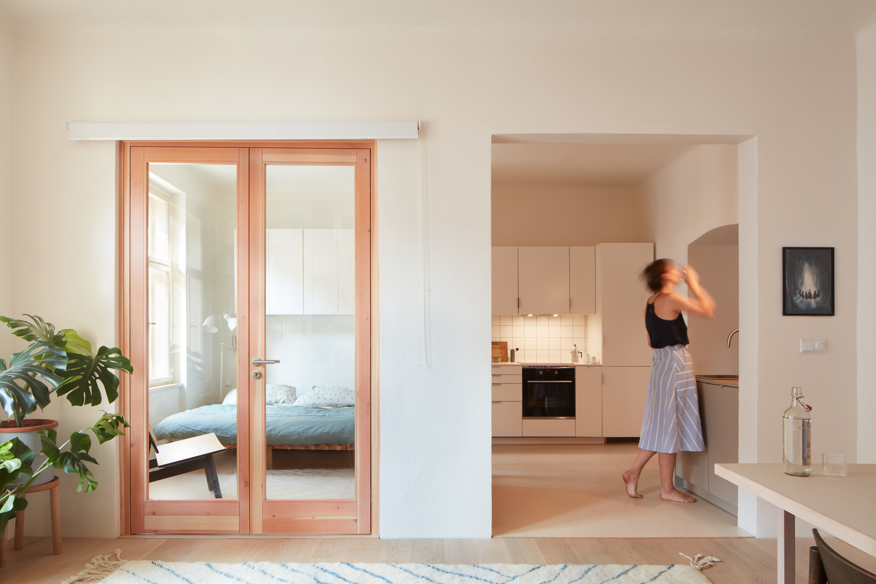 Obytný prostor se již od vstupu rozlévá celou dispozicí a lze jej jednoduše zvětšovat a rozšiřovat o ložnici/pracovnu. Ta je ze dvou stran průchozí, závěsy po obvodě zajišťují intimitu. Druhá polovina bytu patří dětskému pokoji a koupelně. Podlažní plocha dětského pokoje není úplně velkorysá, ale tuto nevýhodu dostatečně kompenzuje patro na spaní schované nad kumbálem. Okénko u postele slouží pro lepší cirkulaci vzduchu ale i komunikaci s ostatními členy rodiny "dole". Koupelna je minimalistická, divoce probouraná tak, aby se do ní vešlo vše potřebné pro mladou rodinu. „Lehkým překvapením při vstupu do bytu může být úplná absence stropních světel – jedinou výjimkou je lustr nad jídelním stolem. Všechna ostatní světla jsou zakomponována v nábytku, světelný zdroj není vidět a jeho intenzita se přizpůsobuje denní či noční době. Tak často podceňované osvětlení bylo v tomto bytě voleno s velkou citlivostí, s velkou iniciativou majitelů a výsledná atmosféra je v každé roční období i denní dobu příjemná,“ doplňují architekti.