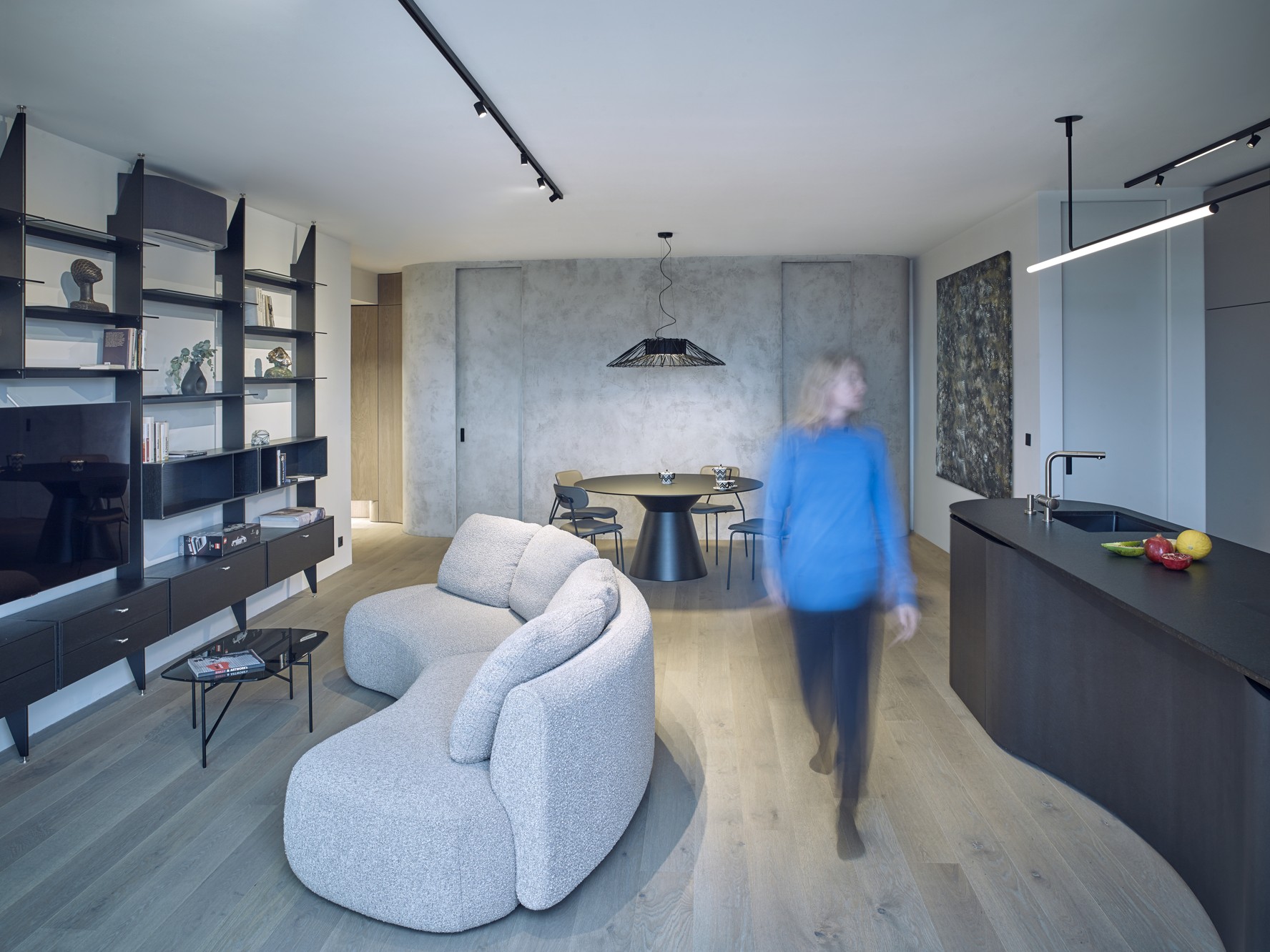 Spolupráce mezi majiteli a designérkou začala už při samotném hledání nemovitosti. Byt byl zakoupen navzdory původně nevhodnému uspořádání právě na základě první studie interiérové přestavby. Realizace zahrnovala nejen stavební úpravy s autorským dozorem, ale i kompletní návrh nábytku na míru, projekt osvětlení, výběr spotřebičů, zařizovacích předmětů i řešení exteriéru včetně zeleně. Dominantou vstupní části je úložný nábytek v elegantním stylu art deco, jehož zvlněné linie plynule přecházejí do dalších částí interiéru. Každý kus je detailně propracovaný, často s integrovaným automatickým osvětlením či mechanickými prvky. Kuchyni definuje výrazný ostrůvek sochařského tvaru a pracovní deska z jediného kusu přírodní žuly, která byla do bytu instalována pomocí vysokého jeřábu přes terasu. Použité materiály – od probarvených MDF desek Valchromat přes lamináty Polyrey Touch až po velkoformátové koupelnové obklady – podtrhují důraz na kvalitu i estetickou čistotu. Celek doplňuje inteligentní systém Loxone, který řídí klimatizaci, podlahové topení, stínění i světelné scénáře podle denní doby a pohybu v bytě.