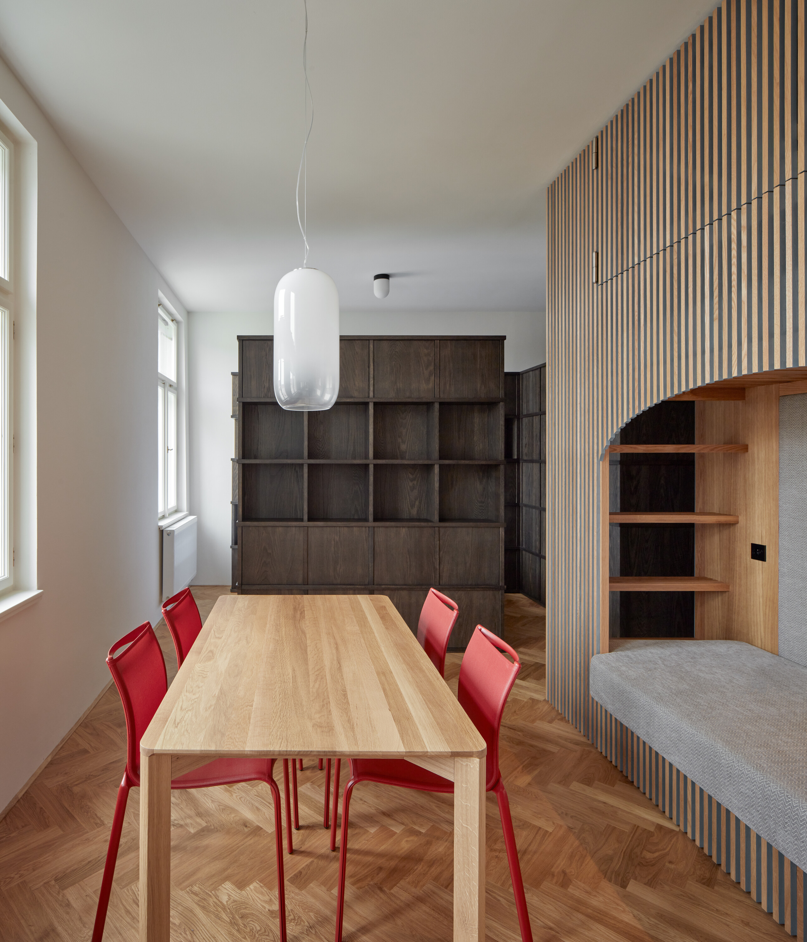 Zadáním projektu bylo vytvořit interiér na míru do minimálního bytu tak, aby se zde komfortně zabydlela čtyřčlenná rodina. Byt svým vlastníkům nemá sloužit jako bydlení trvalé, nýbrž víkendové. „Byt vznikl rozdělením původně větší jednotky, teď má necelých 37 metrů čtverečních. Na této rozloze developer navrhl dispozici 2+kk, což by znamenalo, že by se byt prakticky nedal zařídit a že obyvatelům by bylo souzeno pohybovat se v úzkých koridorech mezi nábytkem,“ vysvětlují situaci autoři projektu z ateliéru ORA (originální regionální architektura). „Investoři nás oslovili ještě v procesu výstavby a díky tomu jsme měli možnost do dispozice zasáhnout. Smazali jsme všechny nepotřebné příčky a vytvořili garsonku. Oddělaná zůstala jen koupelna. Do centra nové dispozice jsme umístili prostor. Obdélníkový prostor, se stolem a židlemi uprostřed. Posuneme-li však stůl a židle stohujeme na sebe, vzniká nám prostor dostatečně velký, aby se jeden mohl protáhnout. Tím jsme se vyvarovali pocitu stísněnosti. Možnost protažení těla jako měrná jednotka stísněnosti.“