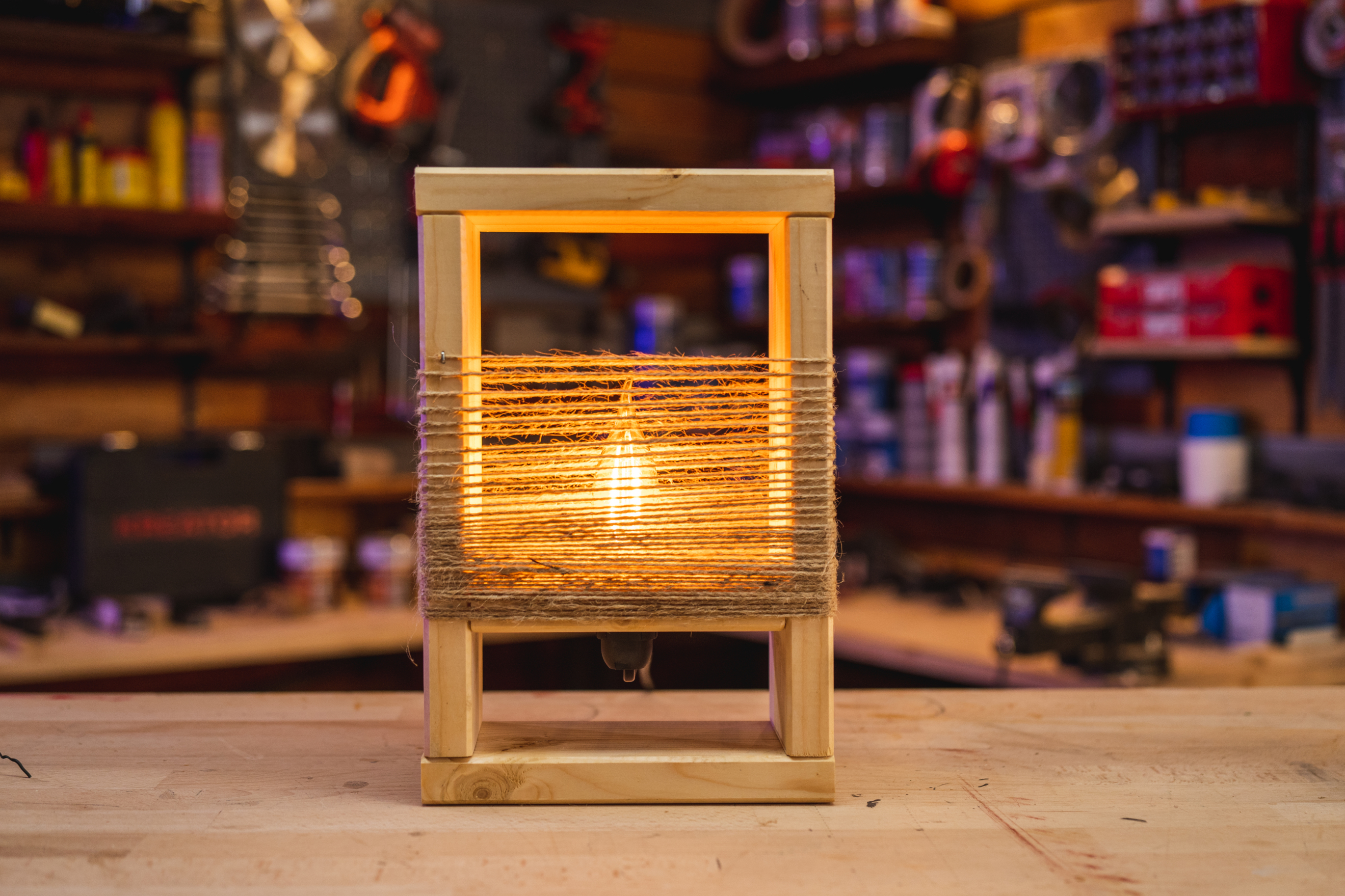 Z provázku vyrobte stínidlo. Uchyťte ho do spáry mezi obdélníkem lampičky a vnitřním prkénkem, ve kterém je umístěná objímka, a jednoduše provázek několikrát obtočte okolo lampičky. Hustota navinutého provázku záleží čistě na tom, jak tlumeného svícení chcete dosáhnout. Na závěr vyzkoušejte, zda lampička svítí. A pak už si užívejte útulnou domácí atmosféru.