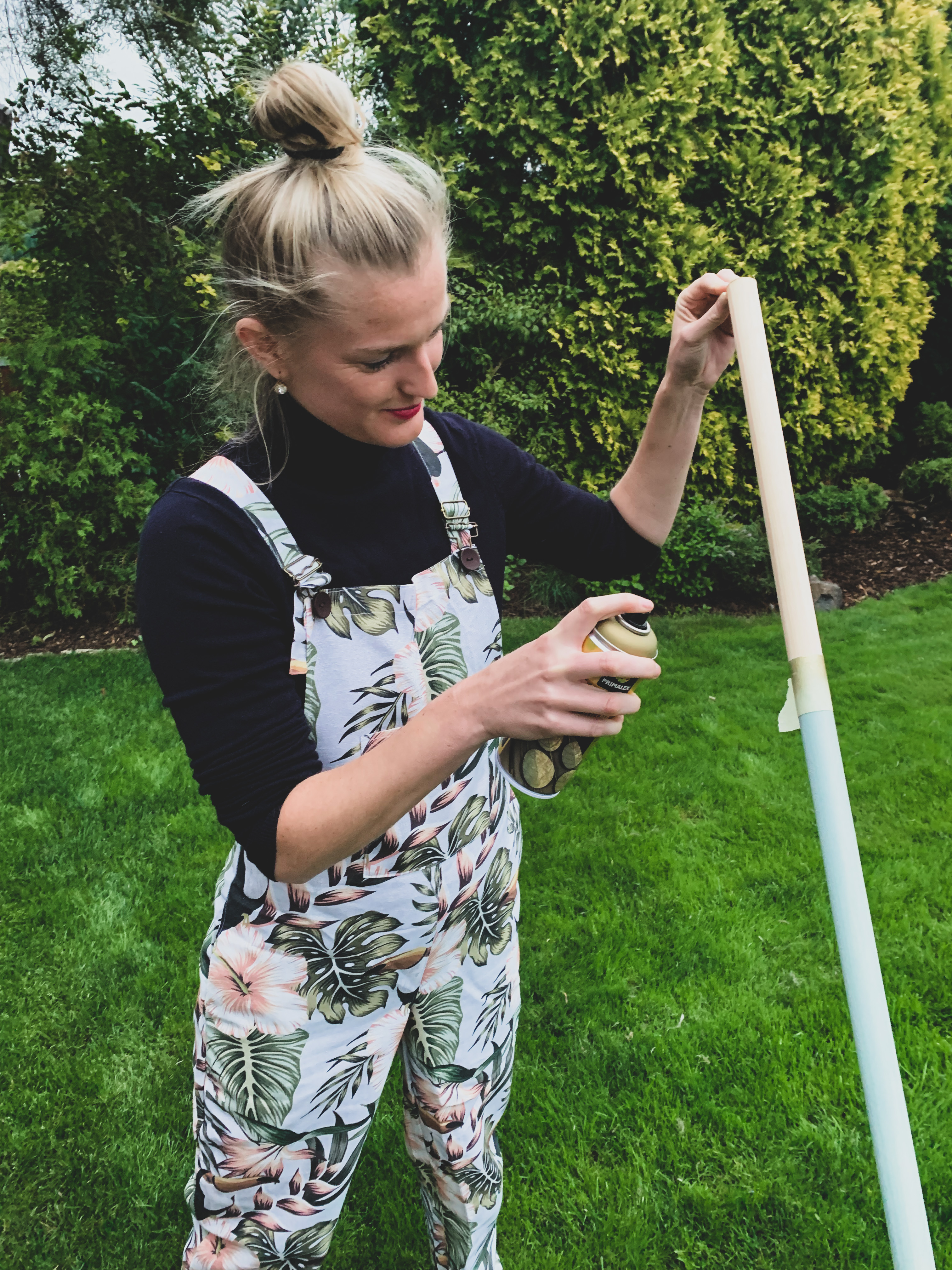 Poté co obě vrstvy nátěru zaschnou, opatrně odlepte krycí pásku a na tyč ji znovu přilepte tak, aby překrývala konec barevného nátěru. Zbylou část tyče pak nastříkejte metalickým sprejem. Doporučujeme začít z té strany, kde je nalepená páska, a pokračovat na konec tyče. Sprej aplikujte ze vzdálenosti 20–30 cm v tenké vrstvě. Další vrstvu pak nanášejte kolmo na směr předchozího nástřiku. Tato rychleschnoucí barva ve spreji dobře přilne a odolá poškrábání. Vytváří navíc efektní kovový vzhled, který věšák povýší na stylový doplněk. My jsme zvolili zlatou, ale na výběr máte i stříbrný, mosazný nebo měděný odstín.