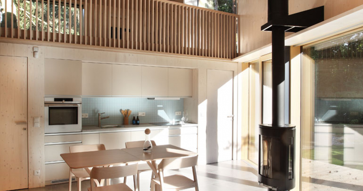 Dominantním materiálem této moderní dřevostavby jsou masivní smrkové dřevěné panely. Nejenže je z nich nosná konstrukce domu, ale především celý interiér, včetně nábytku a vestavěných prvků.