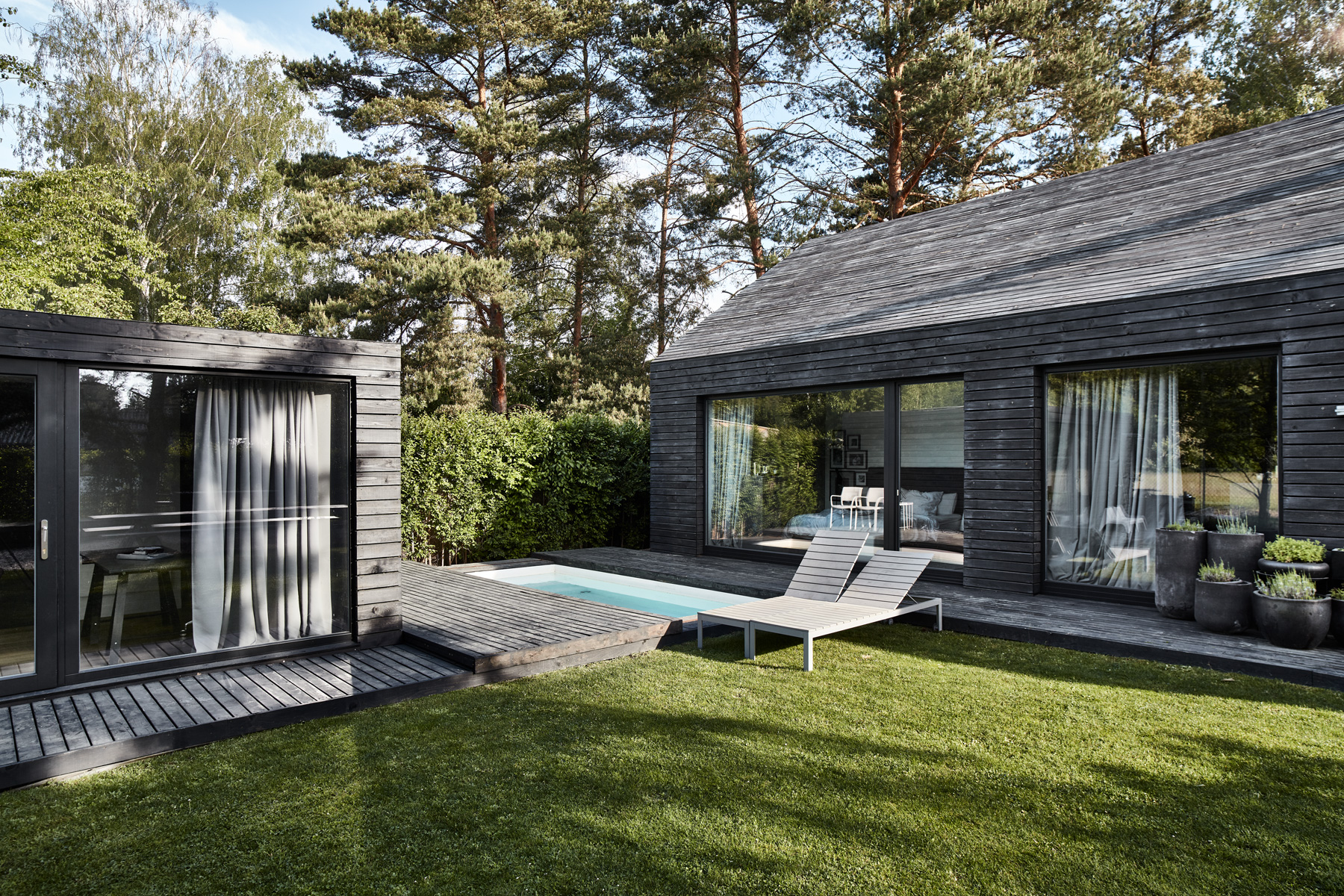 Dům má dřevěný obklad, díky kterému dokonale zapadl do okolní krajiny. Architektka nepovažuje za stěžejní počet obytných metrů, ale účelně zařízený interiér. Výhodou dřevostaveb je velmi krátká doba výstavby. Pokud máte všechna povolení, může být stavba hotová už za čtyři měsíce. Dům stojí na čtyřech železobetonovýchh pásech, které jsou oproti klasickým deskám levnější, a navíc zajišťují spodní provětrávání domu. Jako zdroj vytápění byl vybrán chytrý systém rekuperace, který pracuje na principu zpětného využívání tepla z odváděného vzduchu. Tento systém dokáže ohřívat vodu a rozvádět teplý čistý vzduch průduchy do všech místností. Dalším významným zdrojem tepla je krb. Výrazně pomáhá fakt, že jsou okna situovaná na jih, takže stačí, aby zasvítilo a dům se ohřeje. Dům je navržen jako přízemní, podkrovní prostor je využíván a otevřen z přízemí nade dvěma pokoji. V domě jsou čtyři místnosti— kuchyň s obývacímm prostorem, pracovna, ložnice a pokoj, který je k dispozici návštěvám. Hlavním dekorem všech místností je smrkový obklad shodný s fasádou domu.