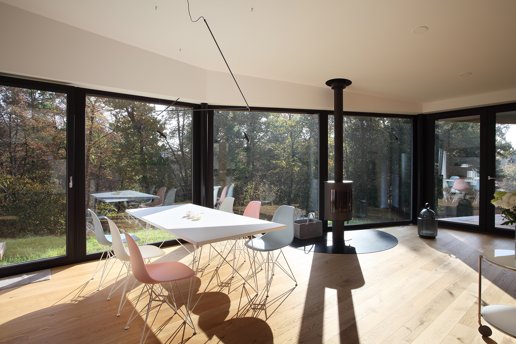 Interiér je laděný do světlých tónů, stěny i všechny vnitřní dveře jsou bílé, což působí velmi čistým dojmem. Útulnost a „teplo“ dodává dřevěná dubová podlaha. Celkový dojem pozvedává osvětlení, promyšlené do každého detailu jedním z majitelů domu, jehož povoláním je světelný design. Samotná dřevostavba patří ze své podstaty k nejšetrnějším a ekologicky nejzodpovědnějším budovám. Tato konkrétní má navíc na střeše umístěny fotovoltaické panely. Dům je zásobován pitnou vodou ze studny na pozemku, ale využívají tu také takzvanou šedou vodu: dešťovka je shromažďována v akumulačních nádržích a poté využívána pro zálivku toalet, na praní prádla a podobně.