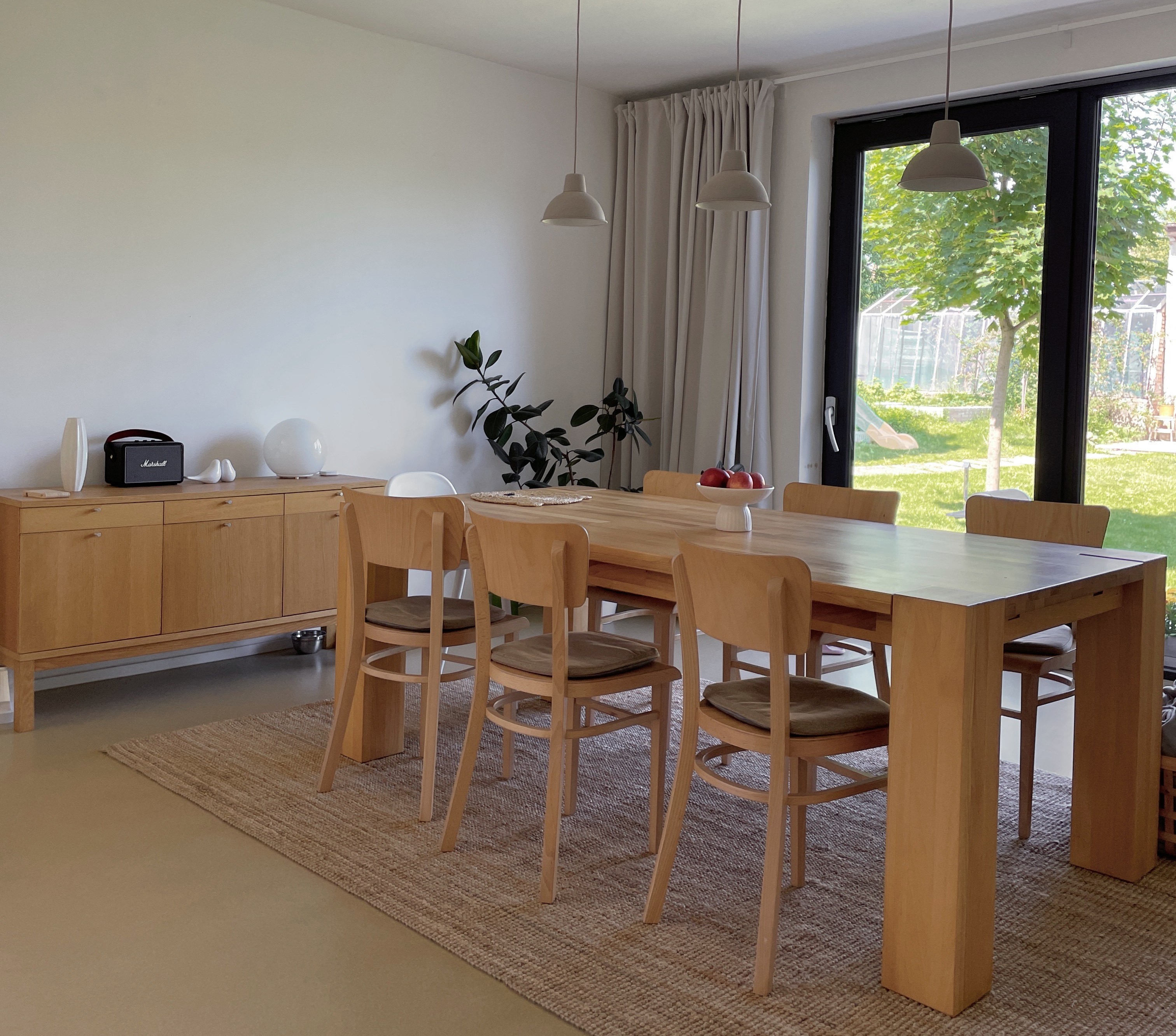 Dům byl zkolaudovaný v roce 1980 a nesl si všechny známky své doby: původní rozvody, starý kotel, zastaralé radiátory i drobné praskliny v omítce. První na řadu přišly technické věci jako výměna kotle, nová střecha, oprava lodžie. Na tři roky se práce pozastavily, ale pak se pustili do kompletní rekonstrukce interiéru. Okna, stropy, odpady, podlahy, omítky, koupelny, kuchyně, to všechno dostalo nový život. Dům se přitom neproměnil ve sterilní novostavbu, ale v prostor, který dál ctí své kořeny. V bývalé kuchyni dnes stojí malá průchozí místnost se dvěma křesly, které majitelé přezdívají „kafeplac“. Odtud je vidět až do obývacího pokoje, kdysi nazývaného „parádní pokoj“. Čas se v něm zastavil, dokud z něj neubralo několik metrů nově vzniklé koupelně se skleněnými luxfery. Rekonstrukci zvládli bez architekta, jen s pomocí několika šikovných řemeslníků. Sami si navrhovali rozmístění místností, vybírali materiály i barvy. Jejich styl by se dal popsat jako propojení starého s novým, minimalistický, ale s duší. Inspirují se funkcionalismem, bauhausem i estetikou mid-century modern, ale vždy zůstávají věrní československému rukopisu osmdesátých let. Dřevo, kov, sklo, materiály, které dům už dávno znal, jen dostaly novou energii.