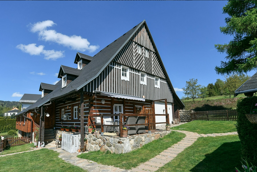 Citlivě zrekonstruovaná chalupa s wellness zónou a spoustou prostoru umožňujícího i vícegenerační využití nebo pronájmy stojí na místě původní hospodářské usedlosti ze 17. století, na jihovýchodním svahu v malé poklidné obci v podhůří Jizerských hor a Krkonoš.