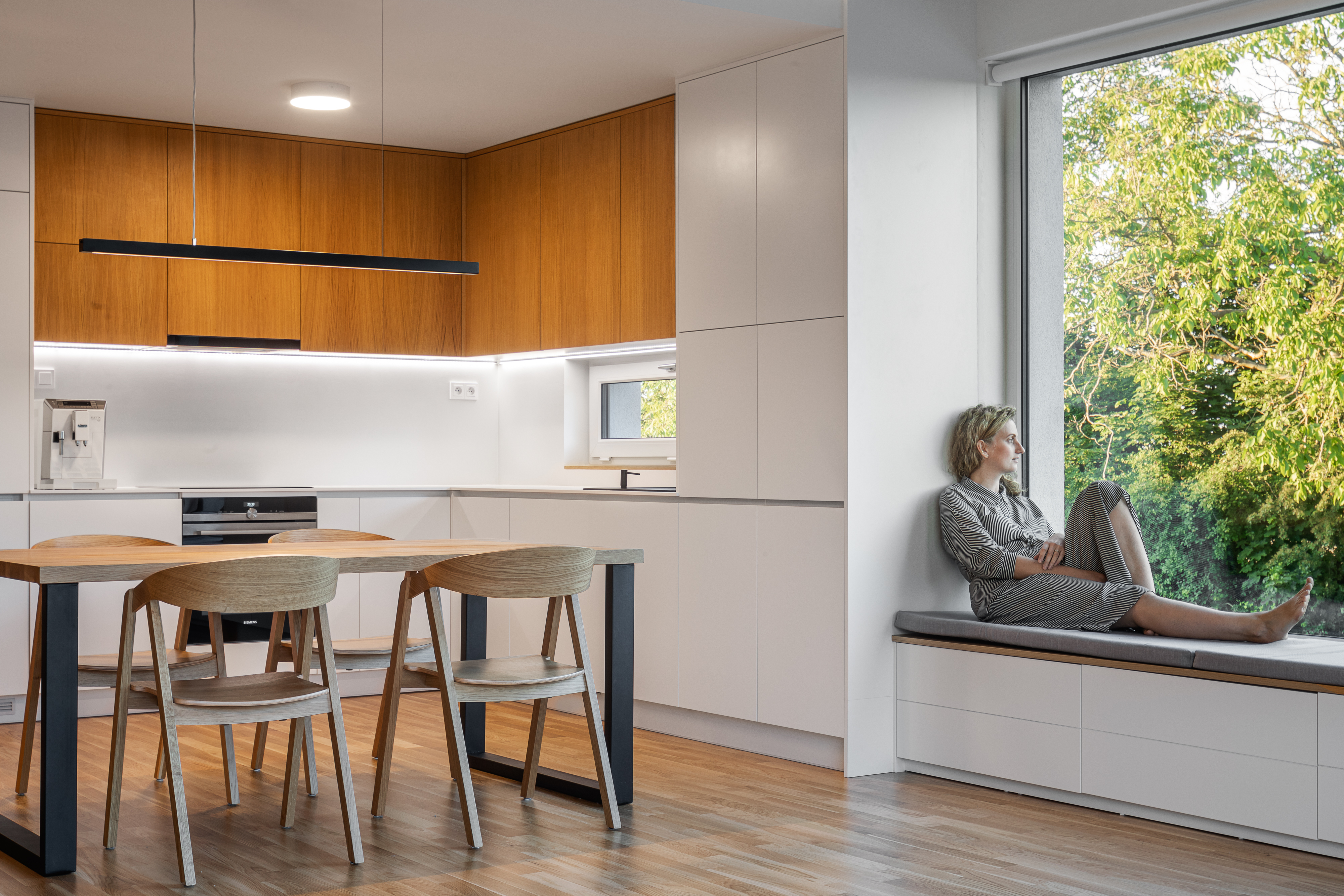 „Interiér je navržen pro mladou rodinu, která tíhne k čistým liniím v přírodních tónech s nádechem do Japonské kultury. Materiálová paleta interiéru je v kombinaci přírodního dubu, betonu a bílé barvy,“ vysvětluje architektka koncepci domu. Výrazné prosklení opticky propojuje vnitřní prostor s exteriérem a zahradou. Srdcem interiéru je unikátní schodiště, které od začátku určilo charakter prostoru a spojuje všechna tři patra domu. Z něj se otevírají společenské i soukromé prostory. Přírodní tóny, čisté linie a dostatek světla vytváří atmosféru, kterou lze snadno vnímat každý okamžik bez rušivých vjemů. V blízkosti schodiště se nachází obytná část s kuchyňským koutem, obývákem a prosklenou stěnou otevřenou do zahrady.