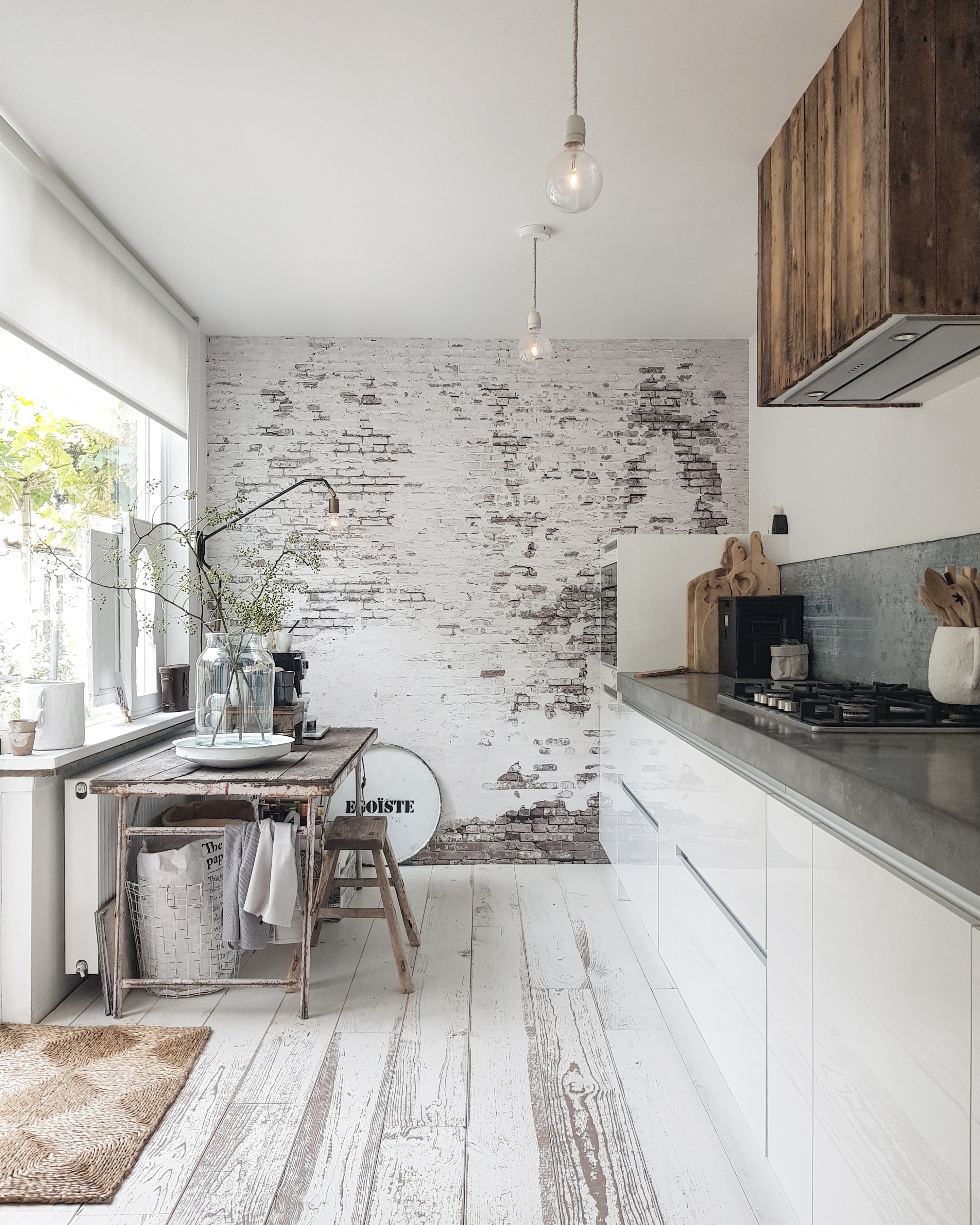 Nových věcí si do nového domova koupili minimum a rozhodně toho nelitují. „Pořídili jsme kuchyňskou linku, jídelní stůl, velkou lampu nad stůl, některé židle a gauč,“ vzpomíná Susan, které nikdo neřekne jinak než Suus. „Nábytek jsme si z velké části vyrobili sami, nebo jsme pořídili věci z druhé ruky v místním vintage obchodě. Ráda kombinuji nové se starým, jako je třeba naše nová kuchyň se starou oprýskanou stěnou, pomalovanou dřevěnou podlahou a starými stolky.“