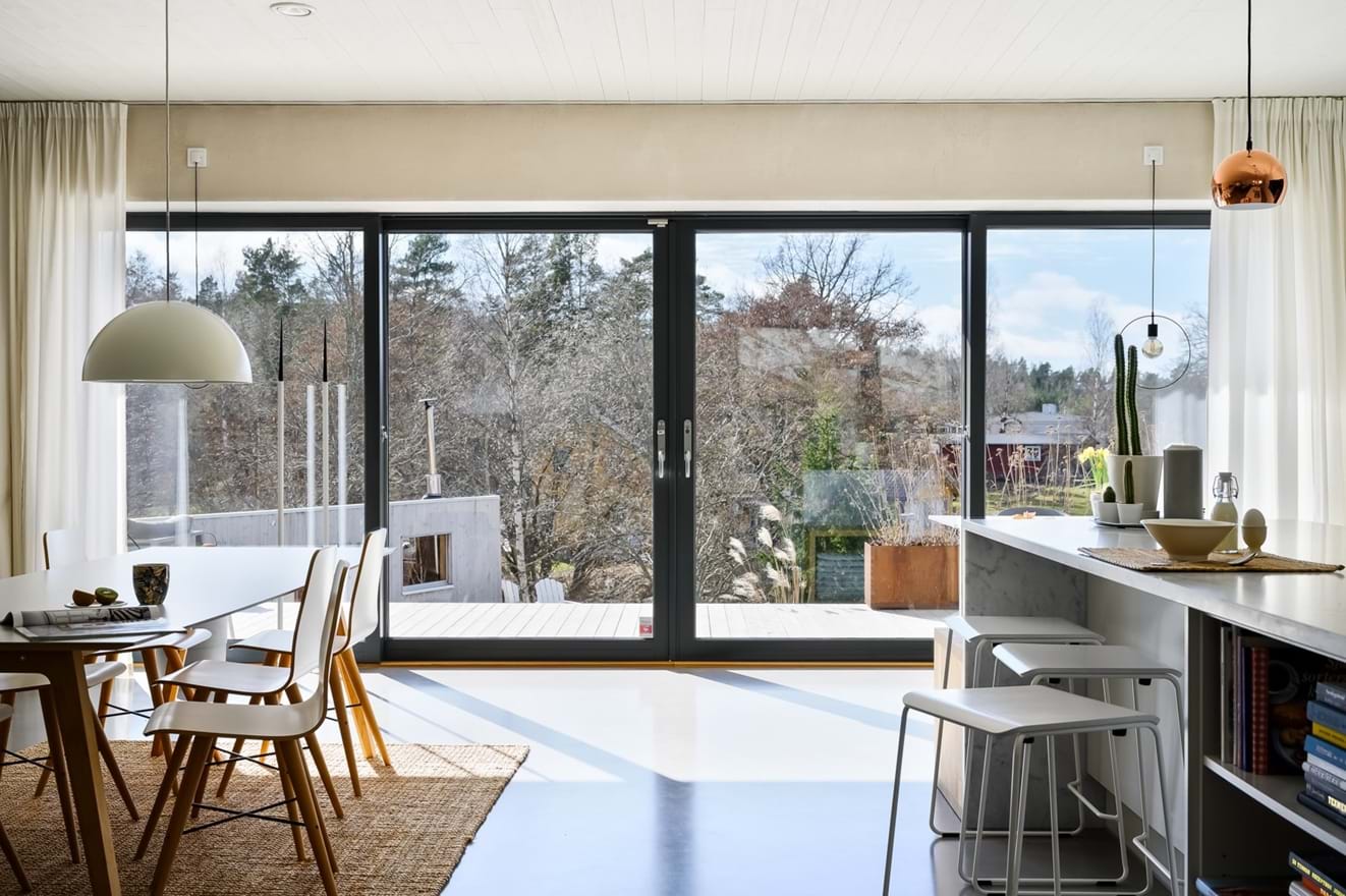 Jedná se o pasivní dům, který funguje v dokonalém souladu s přírodou a ničím ji nezatěžuje. Je umístěný na skalisku a na pozemek svítí slunce po celý den. Kromě hlavní obytné budovy má přístřešek pro dvě auta a nechybí ani venkovní sauna a bazén. Obytná plocha domu je 175 metrů čtverečních rozdělených, které jsou rozdělené na tři soukromé pokoje a společné prostory. Interiéru dominují světlé plochy. Ať už se jedná o borovicové dřevo, které se objevuje na stěnách i stropech, bílou betonovou podlahu, nebo světlý carrarský mramor, který se opakuje v kuchyni i koupelnách. Promyšlený systém svítidel zajišťuje, že je interiér celoročně světlý a ani skandinávské příšeří zde nemá šanci.
