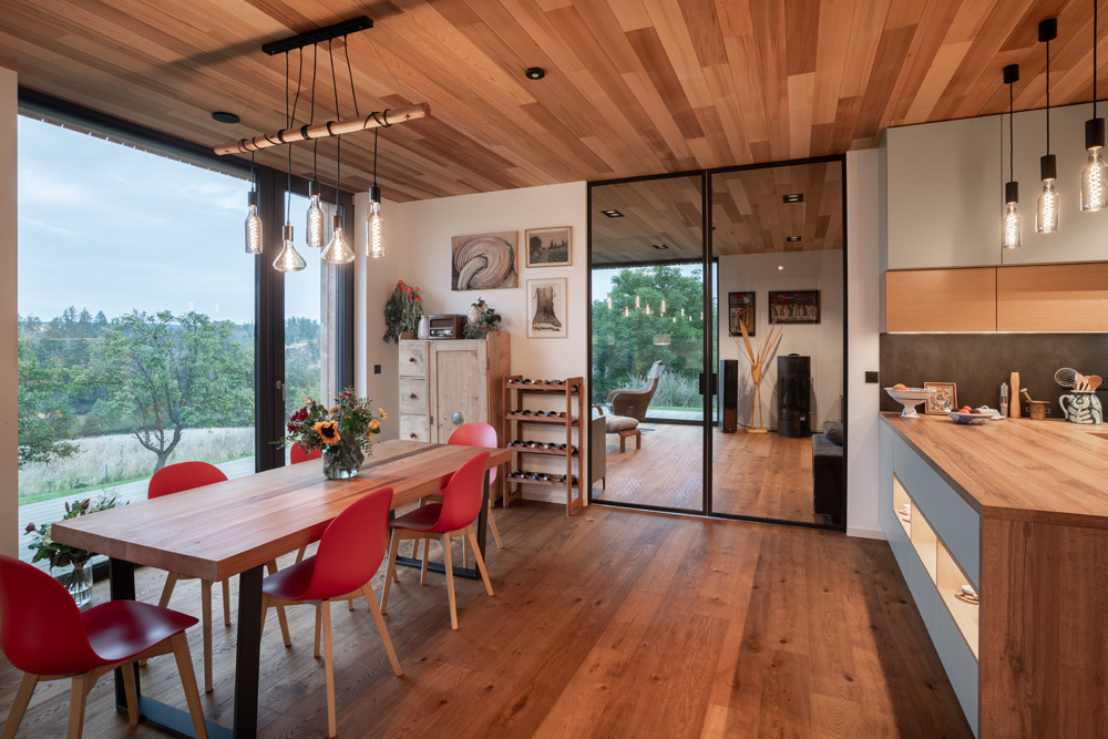 Cílem architektů bylo vytvořit dojem vzdušnosti a zároveň útulnosti. Proto byla použita subtilní hliníková okna na celou výšku místnosti 2,8 metru. Dokonale je doplňují stejně subtilní dveře. Prosklené stěny v části jídelny propojují interiér s venkovní terasou a zahradou, kde má své místo přírodní jezírko a sad. Výhledy byly a jsou pro majitele alfou a omegou tohoto místa i za cenu větších účtů za energie. „U tohoto projektu jsme společně s majiteli upřednostnili výhledy do krajiny, které jsou bohužel severní směrem a je zde tedy mnoho prosklených ploch a sever a méně solárních zisků přes jižní fasádu. Do nízkoenergetického standardu nám pomohlo řízené větrání s rekuperací a fotovoltaické panely na jižní straně střechy, ty však investoři doplnili až po několika letech obývání.“ Ložnice jsou situovány do klidnější západní části domu a nabízí dostatek soukromí pro majitele. Neobvyklým prvkem tohoto interiéru je šalvějově zelená barva. Jako první se objevila na komodě, kterou si pořídili majitelé při zařizování, odrazila se v návrhu kuchyně, a nakonec byla použita i na vstupních dveří, kde krásně kontrastuje s dřevěnou fasádou. Tento dům je důkazem, že bydlení nemusí být okázalé ani složité, aby nabídlo maximální komfort a soulad s přírodou. Není zde cílem přebít krásu okolí, ale nechat ji co nejvíce proniknout dovnitř.