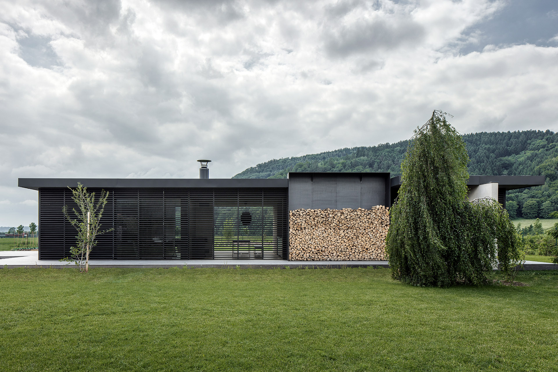 Nakonec vznikla obdélníková stavba o ploše 90 m². Tak je rozdělená na dvě samostatné zóny, tak aby se vzájemně nerušily. V jedné části je ono slibované wellness, v té druhé je garsonka, která má sloužit především jako ubytování pro hosty. Střední otevřená část je koncipována jako místo pro letní posezení s velkým stolem, kuchyňským koutem a krbem. Vlevo od ní je pak garsonka se samostatným vstupem, menší kuchyní, ložnicí a koupelnou. Napravo domácí wellness se saunou, odpočívárnou a venkovní sprchou. Venkovní bazén s protiproudem je lemovaný velkou terasou. Výrazným estetickým prvkem jsou externí stínící panely, které se dají variabilně posouvat, takže se může interiér zcela otevřít, nebo naopak schovat za intimní plášť.