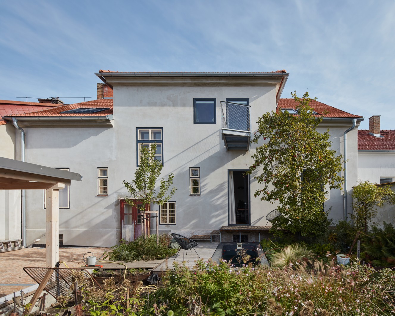 „Podporujeme bytelnost významných prvků, přiznáváme prvky utilitární a vložené. Fasádu do zahrady otevíráme zvětšením významných otvorů. Čisté celoprosklené plochy v hladkých hliníkových rámech akcentují vstupy nové architektury v kontrastu s jemnými detaily dělených špaletových oken. Do drobné výškově členité zahrady přinášíme třetí harmonizující úroveň,“ vysvětlují architekti. Podél obytného prostoru se táhne dřevěná lávka, která klesá pobytovými “koňskými” schody na nejnižší úroveň cihelného plácku. Zde se k původní zdi přimyká jednoduchý objekt venkovního zázemí. „Do podkroví vkládáme nízké servisní objemy, jinak se prostor otevírá na celou výšku krovu. Kolem nízkých objemů koupelen a šaten se uvnitř dispozice rozvíjí dva byty – garsoniéra a 2 kk. Úrovně podlah se přizpůsobují původním konstrukcím v podkroví tak, aby podtrhly význam nového vnitřního uspořádání. Vysoko posazená střešní okna přináší světlo do celého prostoru. Okolo sošného komína i skrz světlíky do koupelen, které nemají fasádu. Původní dřevěnou verandu na západní fasádě nahrazujme lehkým vykonzolovaným molem, které poskytuje unikátní výhled na bývalý františkánský klášter v sousedství.“