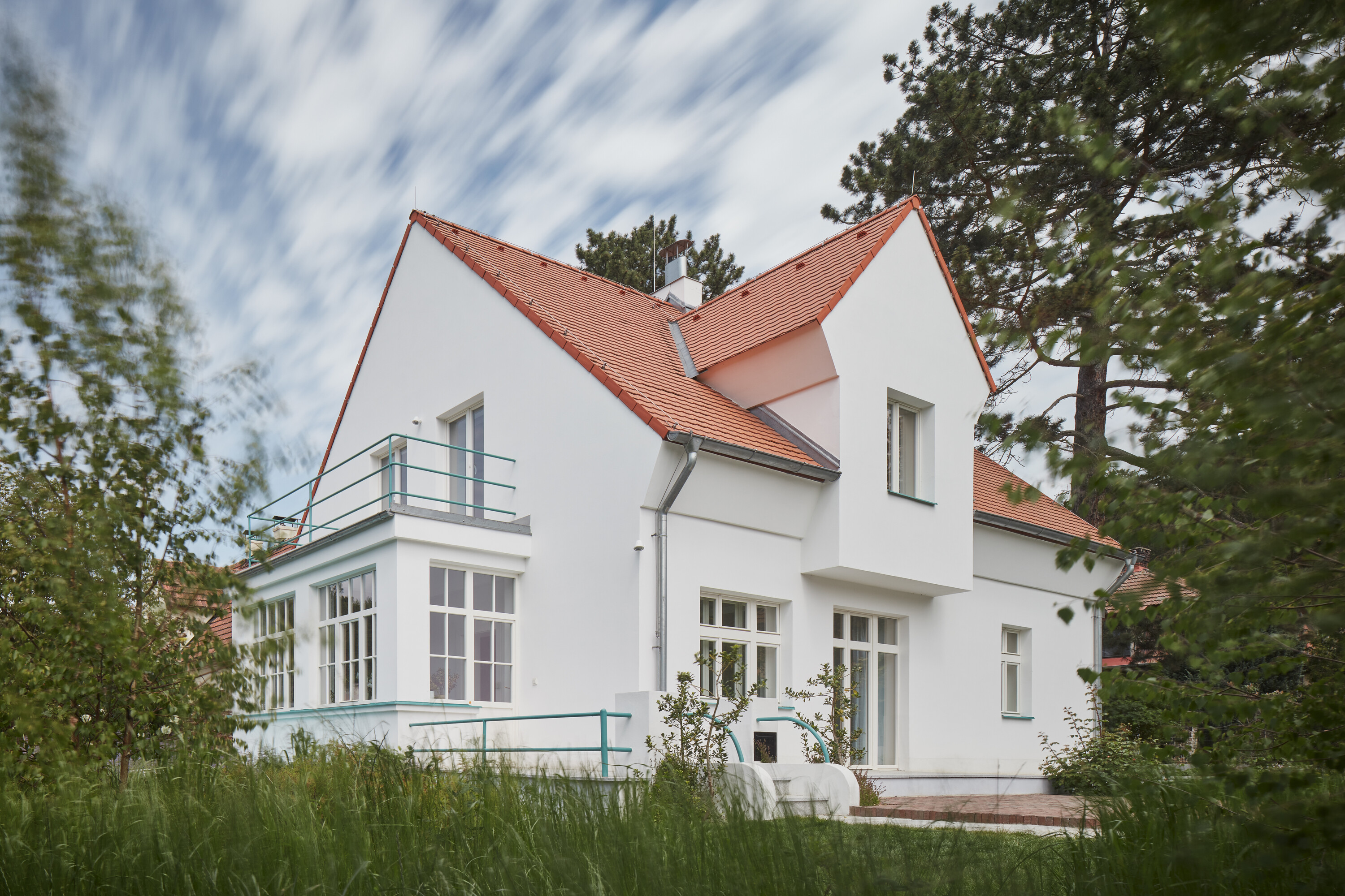 Rodinný dům je navržen pro čtyři osoby, tomu odpovídá i jednoduché dispoziční řešení. Vstup do objektu vede ze severozápadu od ulice a samotné zádvoří je jasně oddělené od obytné části. Jsou zde umístěné praktické vestavěné skříně. Odtud vejdete do haly, kde stojí schodiště vedoucí do druhého patra. V přízemí je pokoj pro hosty, kuchyně a hlavní obytná část s východem na terasu. Do druhého patra je pak situovaný dětské pokoj, pracovna a hlavní ložnice s koupelnou a šatnou. „V interiéru rodinného domu jsou navrženy dispoziční změny, které vyžadovaly zvětšení některých otvorů v nosných stěnách, vybourání některých příček a zvětšení otvorů na fasádě směrem do zahrady. Charakter a hlavní hmota domu byla zachována,“ popisují architekti. „Návrh v exteriéru zahrnoval výměnu okenních výplní, zateplení objektu, novou omítku a novou střechu. Jednoduchost návrhu se promítá i do materiálového a barevného řešení. Materiály použité na původním objektu byly pouze obměněny za nové. Střecha i fasáda mají obdobný charakter jako před začátkem rekonstrukce. Fasáda byla zateplena a došlo k výměně okenních výplní.“