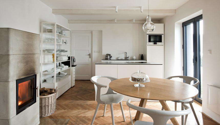 Celý prostor je laděn v odstínech bílé a šedé. Celkově byl interiér ve stavebním detailu pojat přísně minimalisticky, příkladem je absence soklů u dlažeb, parapetních desek u oken, obkladu stěny kuchyňské linky, závěsů, záclon apod. V tomto minimalistickém duchu byla vybrána i svítidla, v podstatě v celém objektu jsou použity 3 druhy svítidel a tím dostává interiér kompaktní a minimalistický charakter. Součástí rekonstrukce a dostavby chaty je i rekonstrukce samostatné stavby původní dílny, která byla přestavěna na společenskou místnost a pracovnu. Základní výtvarný prvek této rekonstrukce je původní ocelová repasovaná konstrukce. Podlaha je zde z modřínu, lakované skříňka a jídelní stůl byly vyrobený na míru. Strop je mezi vazníky obložen modřínem natřeným bílým mořidlem v severském stylu. Topí se v norských litinových kamnech na dřevo. Industriální osvětlení pochází z 30.let. Celkově se podařilo vytvořit velmi pohodlný a funkční prostor o rozměrech bytu, s dostatkem úložných prostor a krásnými výhledy do okolního lesa a zahrady. Přestavěná bývalá dílna navíc umožňuje oddělit společenský život od soukromého prostoru majitelů v bývalé chatičce.