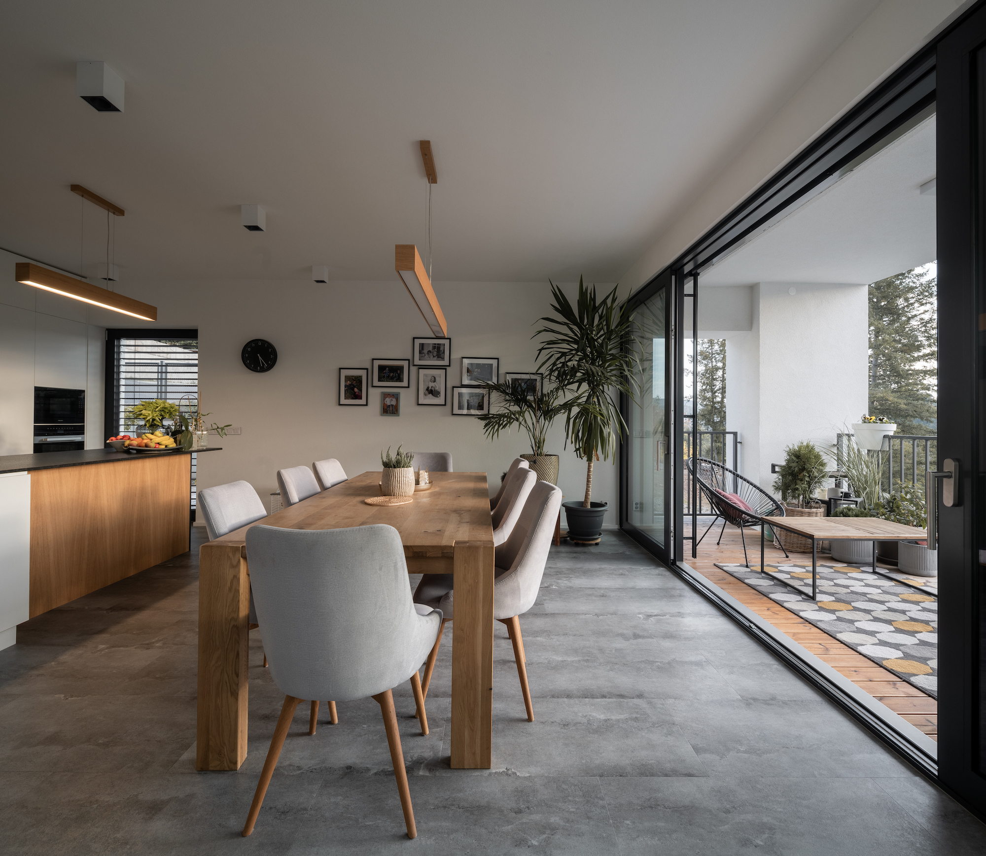 V obytném patře najdete otevřenou kuchyň s barovým ostrůvkem, jídelním stolem a převýšeným obývacím prostorem. Na jídelnu navazuje prosklená lodžie, která umožňuje vychutnat si pohled do údolí. Dále se tu nachází ložnice s vlastní koupelnou a šatnou, centrální točité schodiště a spíž, která je průchozí do garáže. O patro níž jsou pak tři dětské pokoje, koupelna, technická místnost a prádelna. V nejvyšším patře je pracovna s výhledem skrz vysoký obývací prostor, kuchyňka a koupelna pro hosty. Toto patro je také samostatně přístupné přes malé technické zádveří. Místem setkávání, a tedy srdcem domu, je převýšený obývací prostor s velkorysým oknem. To z venku dominuje kompaktní bílé hmotě vily. Protiváhou výrazné skleněné ploše je prostorná lodžie, díky které působí celek harmonicky. Dům dále doplňují terasy a terénní schodiště, které dotváří vhodné propojení s okolní zelení. Právě vhodné usazení vily na pozemek tak, aby byl výsledek co nejpřirozenější a zároveň ekonomicky co nejméně náročný, bylo klíčové. Architekt si s tím poradil díky tomu, že si nechal pozemek geometricky zaměřit a následně vlastnoručně vyrobil precizní fyzický model. Modely jsou poznávacím znamením Ing. arch. Vacíka i dnes, jen si je již tiskne na 3D tiskárně.