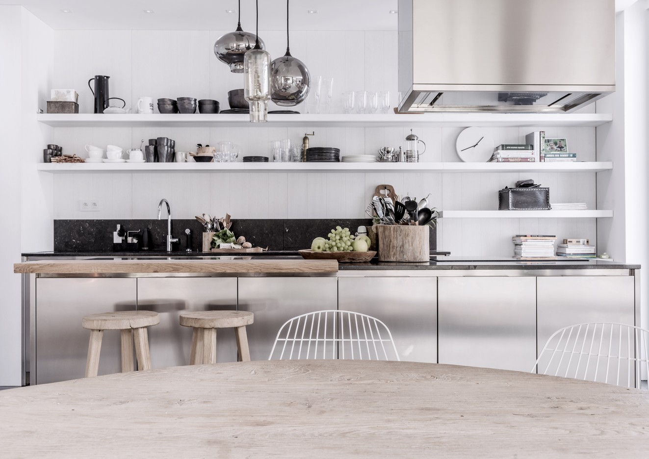 V hlavní roli je bílá barva, která je použita v mnoha odstínech a strukturách na dřevěných olejovaných podlahách, na hrubě drásaném dubovém nábytku nebo bílém mramorovém obkladu a prochází interiérem i na textilu - bílý len na povlečení a závěsech. To vše v kombinaci s detaily z hrubého starého dřeva.