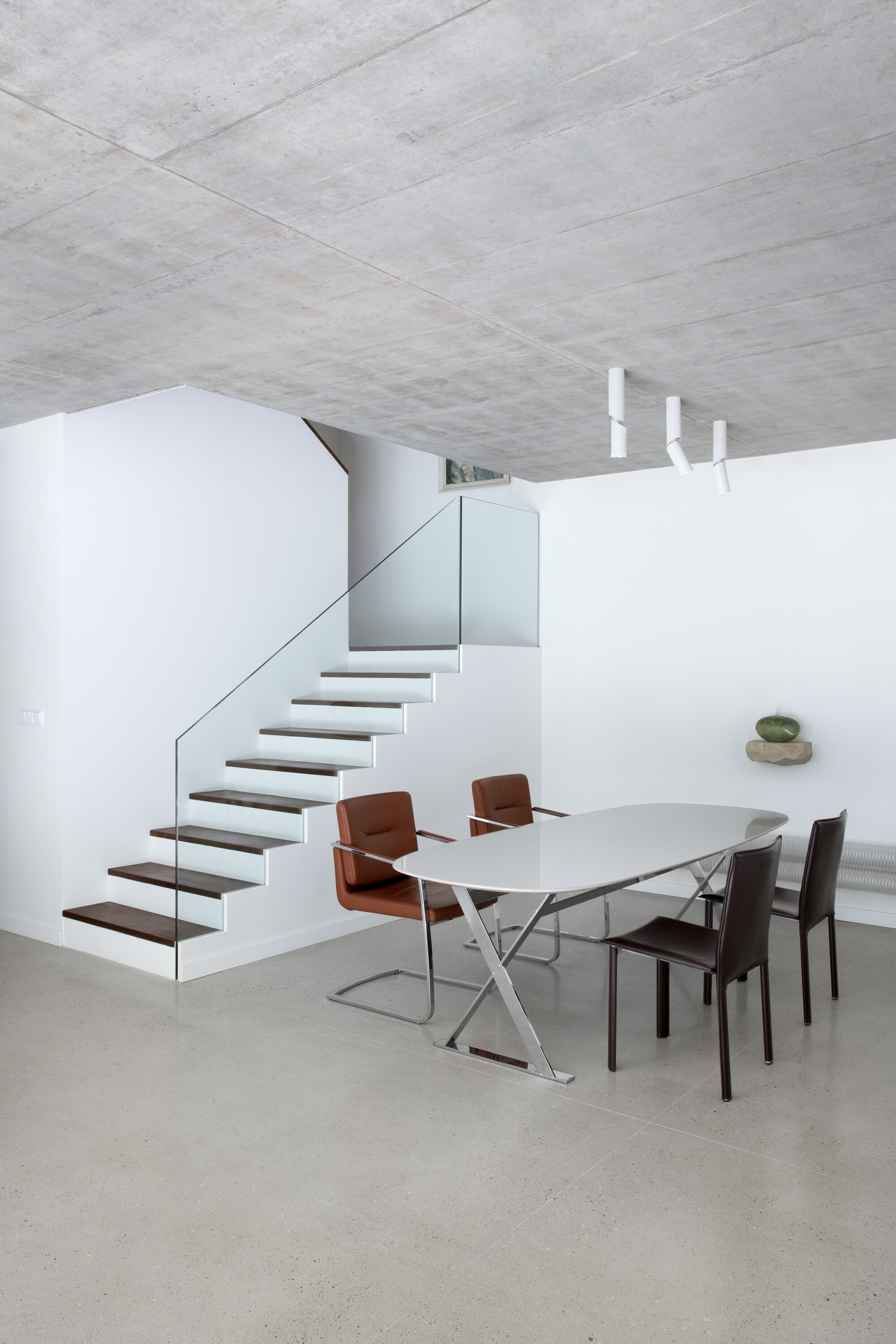 „Centrální dvoupodlažní hmota s hlavními obytnými prostory orientovanými do zahrady je přes krčky propojena s jednopodlažními křídly – relaxačním zázemím a garáží. Fasáda objektu je omítaná, tvarově jednoduchá a jednotlivé hmoty budovy gradují ve stupnici bílá – šedá – černá. Střechy objektů jsou pokryty vegetačním souvrstvím podporujícím začlenění objektu do okolí.“ Interiéry jsou minimalistické, podlahy a stropy provedené z pohledového betonu. Stěny jsou omítané, pouze bílé. V interiéru je použit pouze minimální počet nábytku. Detaily jako otevřené ohniště, kamenná police pro japonskou vázu, nebo několik zajímavých obrazů vytváří spolu s nábytkem zajímavou a hravou atmosféru. Celý dům má odrážet skromný, avšak vysoce vytříbený styl investora a jeho smysl pro rovnováhu, klid a harmonii.