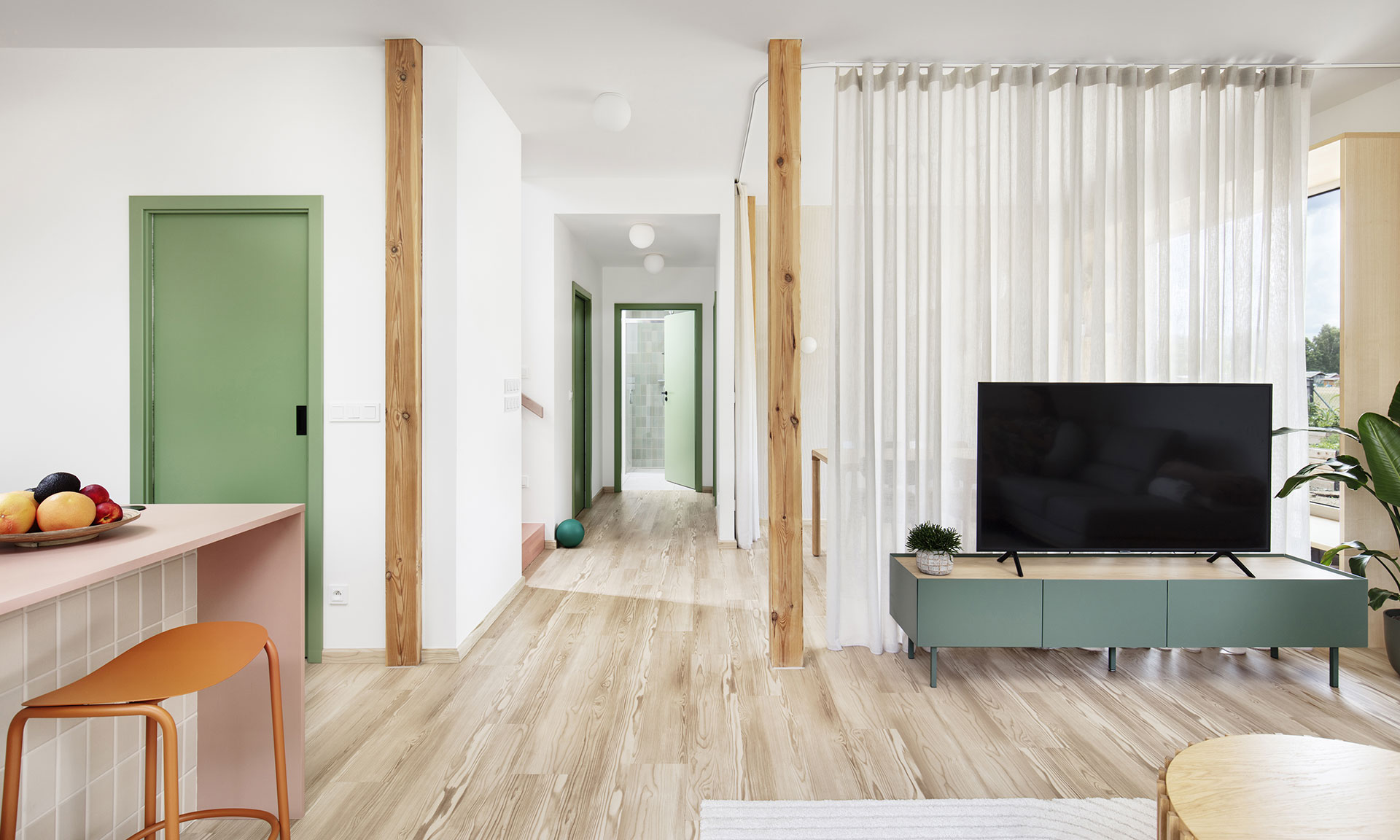 Společenským srdcem dispozice 4+kk je velkorysý obývací prostor napojen na kuchyňský kout a jídelnu. Ta může být variabilně oddělená závěsem a poskytovat tak různou úroveň soukromí, ať už se večeří nebo relaxuje v zarámovaném výhledu čtecího okna. Dostatek denního světla nahrazují v průběhu dne pečlivě vybraná svítidla vyzdvihující intimnost jednotlivých mikroprostor jako jsou kuchyňský ostrůvek nebo jídelní stůl. Spodní patro doplňuje pracovna s charakteristickým výhledem do zahrady. Centrální schodiště propojuje společenskou část v přízemí s patrem klidové části, s ložnicí s otevřeným krovem a dětským pokojem. Obě patra jsou vybaveny výraznou koupelnou s důrazem pro detail. „Teplo domova dotváří použité materiály, jasanové dřevo v kombinaci s pastelovými odstíny zelené a pudrové. Pestrost interiéru doplňují textury, ať už se jedná o koberce, stěrky, dlažbu nebo filcové niky. Návrh maximálně odráží potřeby rodiny, velká kuchyň vybízí ke společnému vaření nebo hraní si s kávou. Dům skrývá i možnosti odpočinku, soustředění a soukromí. To vše zabalené v hravosti, která je klientům vlastní,“ uzavírá autor projektu.