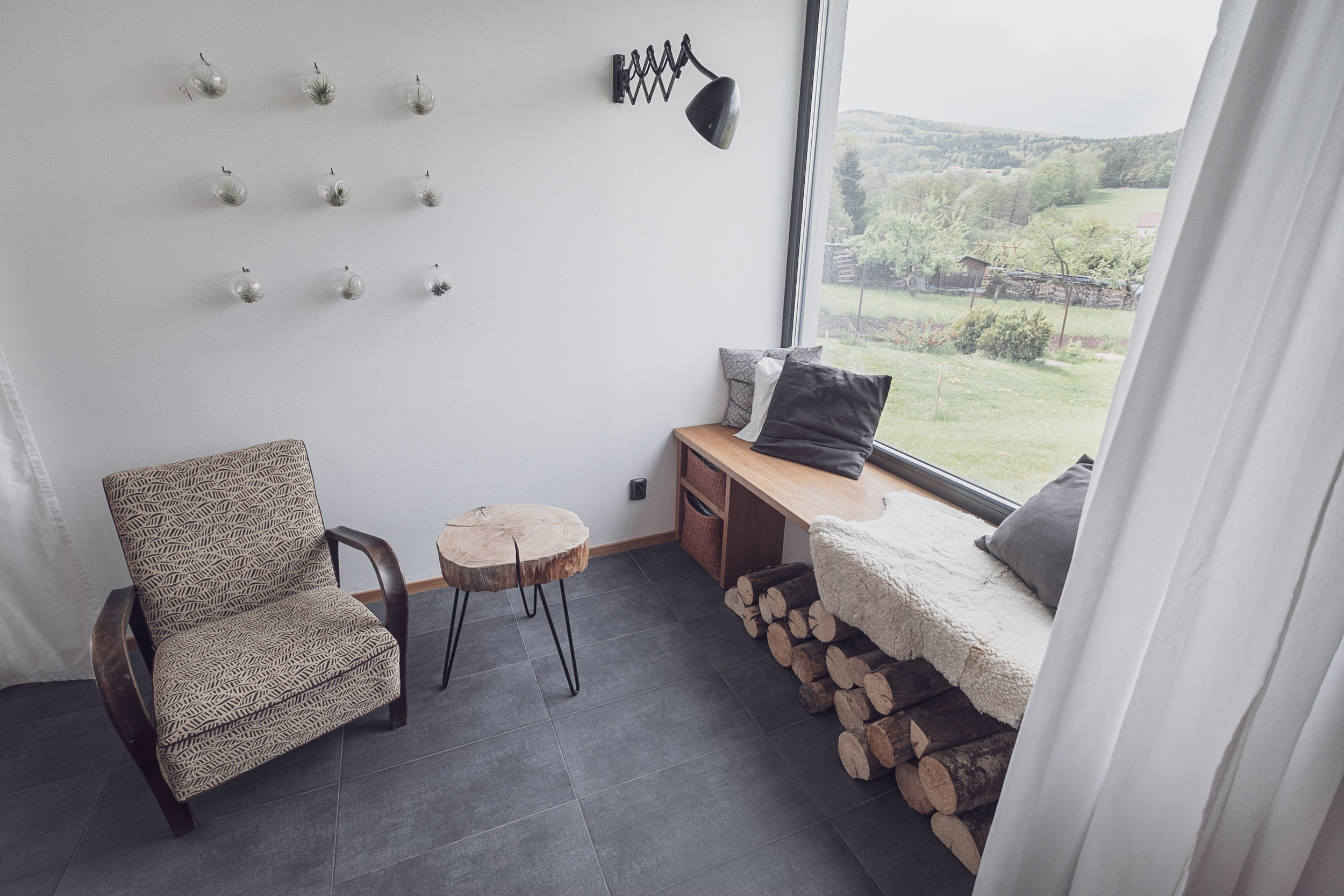 Na samotném počátku stavby uvažovali architekti také o dřevostavbě, nakonec se rozhodli pro klasické jednovrstvé zdivo z cihelných bloků bez dodatečného zateplení, které bylo pro stavebníky dobře dostupné a bylo ho možné realizovat bez větší mechanizace svépomocí. „Vnější povrchy jsou tvořeny bílou omítkou a červenou pálenou taškou. Sklep je vystavěn z pohledových šalovacích bloků s vegetační střechou,“ popisují. „Energetická koncepce vychází z jednoduché úvahy, že nejúspornějším řešením je malý kompaktní dům. Vystačí si proto s jednoduchým tepelným čerpadlem vzduch-voda. Doplňkovým zdrojem tepla je lokální topeniště na dřevo, kterého je v okolí dostatek. Nízkoteplotní rozvody tepla jsou vedeny v podlahách, čímž byl uspořen prostor, který běžně zabírají radiátory. Uvnitř domu jsou připraveny rozvody na nucenou výměnu vzduchu. “ Také interiér koresponduje s jednoduchostí exteriéru. Díky tomu je stavba ve všech ohledech kompaktní. „Omezené prostorové možnosti byly hlavním motivem pro volbu na míru navrženého nábytku. Zpravidla jsou využity neutrální světlé odstíny či přirozené zbarvení nábytkářské překližky. Další vybavení jako jsou sedací souprava, stoly, židle aj. zase ctí pravidla severského stylu. Otevřenost a útulnost mají být hlavními přívlastky interiéru. Celkovou atmosféru prostoru výrazně doplňují solitérní sběratelské kusy majitelů. Industriální svítidla, staré vývěsní cedule či nádražní hodiny jsou jen krátkým výčtem rozrůstající se sbírky. “