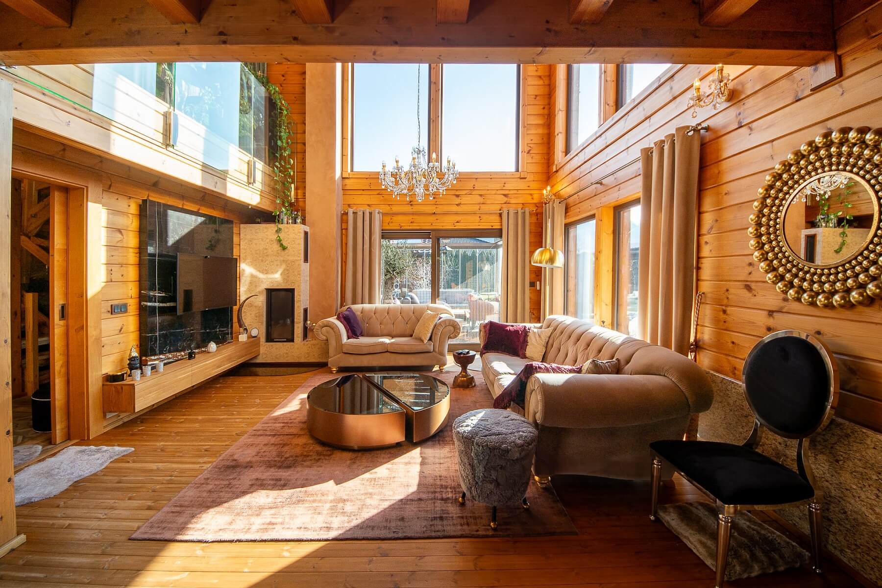 Originální čtyřpokojový srub je vyrobený z finské polární borovice a nachází se v poklidné obci Sokolovce vzdálené 10 minut od lázeňského města Piešťany. Majitelé si vybrali tuto klidnou lokalitu, protože v sobě snoubí ticho přírody s rekreačním vyžitím i kompletní občanskou vybaveností. Srub je uzpůsobený tak, že přízemí tvoří prostorná vstupní hala a prosluněný obývací pokoj s vysokým stropem. Ten má v nejvyšším bodě až 8 metrů a je propojený s kuchyní a jídelnou. Dále je tu hlavní ložnice s en-suite koupelnou a walk-in šatnou, další pokoj, který slouží návštěvám s přilehlou koupelnou, walk-in šatna a technická místnost s prádelnou. Celou zadní část domu lemuje prostorná terasa a je možné na ni vyjít rovnou z obývacího pokoje.