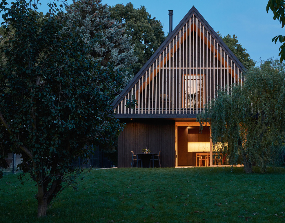 Funkční dispoziční řešení dělí objekt na severní obslužnou a jižní pobytovou část. Přízemí obsahuje dvě garsonky se samostatnými vstupy, vstupní a technickou část hlavního bytu a větší obývací pokoj s kuchyní. V podkroví se nachází ložnice, pracovna a koupelna hlavního bytu. „Důraz byl kladen na maximálně jednoduché hmotové řešení. Štíty pohledově vystupují coby jasně definované trojúhelníky a jsou zvýrazněny světlými dřevěnými stínícími prvky. Tvar střechy a její přesahy vychází z typických tvarů původních chat, zároveň poskytují stínění jižní fasády a chrání terasu před deštěm. U hlavní ložnice, za stínícími lamelami, vzniká vykonzolovaný balkon venkovní pokoj,“ vysvětluje autor projektu. Materiály jsou nenápadné a přírodní – v exteriéru opálené dřevo, v interiéru pohledové CLT panely, nábytek koresponduje s tmavou fasádou. Dům je v nízkoenergetickém standardu s elektrickým podlahovým vytápěním a vzduchotechnikou s rekuperací.