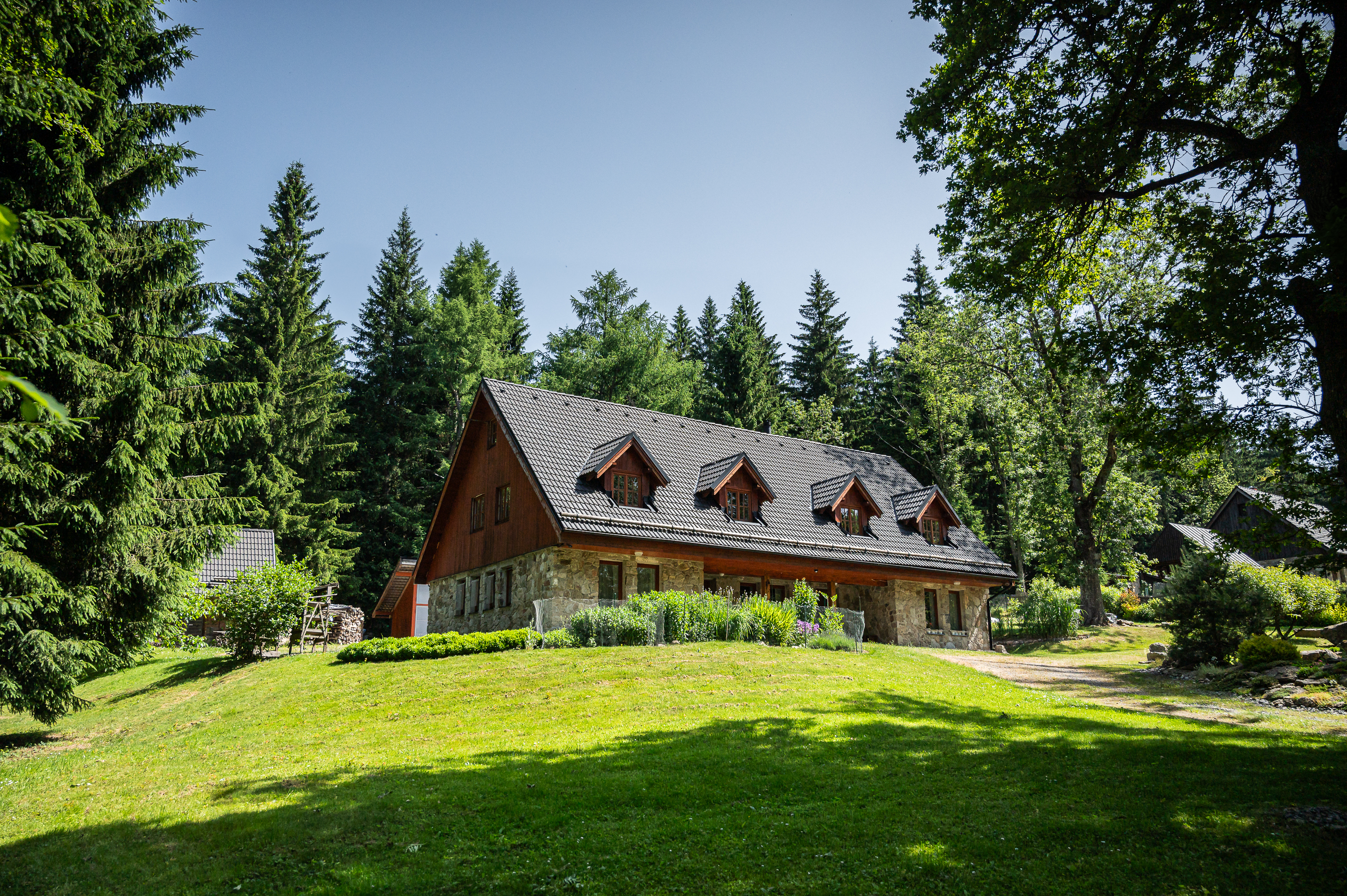 Interiéru dominuje přírodní dřevo, ať už jsou to masivní trámy, dřevěné rámy oken nebo podlahy. Jako celek vytváří hřejivou atmosféru. Kuchyně je vybavena moderními spotřebiči, a i když je hlavně praktická, působí velmi útulně. Prostor doplňují decentní dekorace a barevné obrazy dodávající prostoru osobitý charakter. Velká okna jsou pak už jen třešničkou na dortu a nabízí nádherný výhled do zahrady. Zimy tu bývají tuhé, ale v tomto domě nezmrznete. Přízemí a první patro vytápí podlahové vytápění prostřednictvím tepelného čerpadla a samozřejmě nemohou chybět ani krbová kamna, která plní funkci praktickou i estetickou. Stejně výjimečný jako samotný dům je i pozemek s rozlohou 3 261 metrů čtverečních kolem něj. Udržovaná zahrada s koupacím jezírkem a vzrostlými stromy poskytuje spoustu soukromí a prostor pro odpočinek. Na pozemku stojí garáž pro tři auta se skladem a úložnými prostory nebo dvoupodlažní zateplený domek s elektřinou a krbovými kamny s různorodým využitím. Dům sám i jeho poloha vybízí k relaxaci nebo rodinným setkáním. Je to místo, které si rádi zvyknete nazývat domovem.