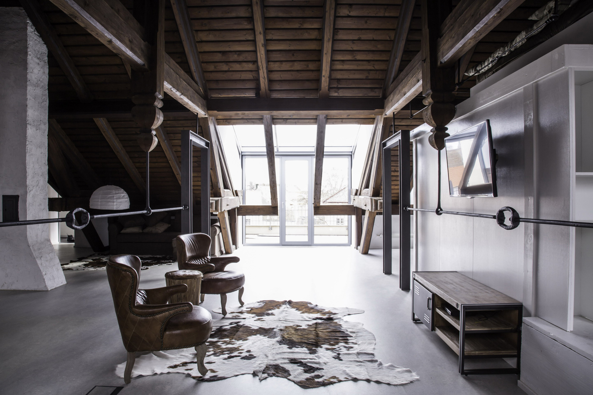 Nejdůležitějším rozhodnutím, před kterým architekti stáli, bylo ponechat vše v původním stavu. „Jedním z našich pravidel je, že někdy není nejdůležitější částí designu navrhovat,“ vysvětlují. „Atika byla členěna ocelovými pruty v ustáleném rytmu a bylo potřeba propojit prostor a najít cestu, jak pruty přejít. Zvětšili jsme rektifikační smyčky a vytvořili rámy ve velikosti lidského těla. Tyče rozdělují prostor na jednotlivé „místnosti“. Stěny jsou imaginární stejně jako ve filmu Kim Ki-duka. Nejsložitější ale bylo najít někoho, kdo se do tohoto prostoru vejde. Je to široce otevřené studio. Dělali jsme i rodinnou verzi, ale ta byla příliš složitá. Nakonec jsme našli ideální obyvatele, pár. Využívají ho jako letní místo v době pobytu v České republice. Rozpočet nás tlačil na některá kompromisní řešení a několik hrubých detailů, které jsou součástí konceptu. Doufáme, že starý duch byl zachován.“