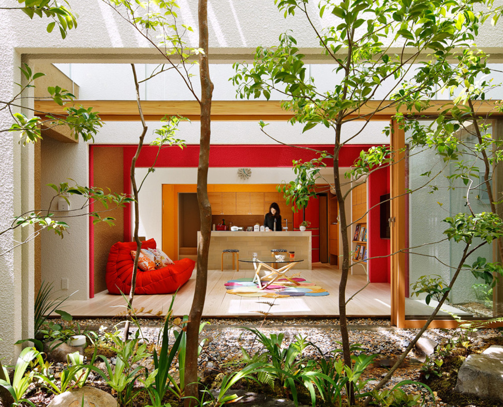 Celý dům je rozdělený zdmi na místnosti a z fotek se může zdát, že vytváří jakési barevné bludiště plné tajemných zákoutí. Pobyt v takovém prostředí naopak navozuje potřebný klid a harmonii a autoři projektu se důkladně zamýšleli nad tím, jak využít každé změny světla i pohyb větru. Interiér se proměňuje spolu s ročním obdobím a jednotlivé barvy stěn tyto změny odráží. Keře a stromy uvnitř interiéru prochází také touto změnou, a tak majitelé mohou přímo u sebe doma pozorovat kvetoucí třešeň, letní bohaté listy ginkgo, ale i zimní borovice a bambus. Vitalita rostlin, stromů a květin oživuje jinak chladnou architekturu.