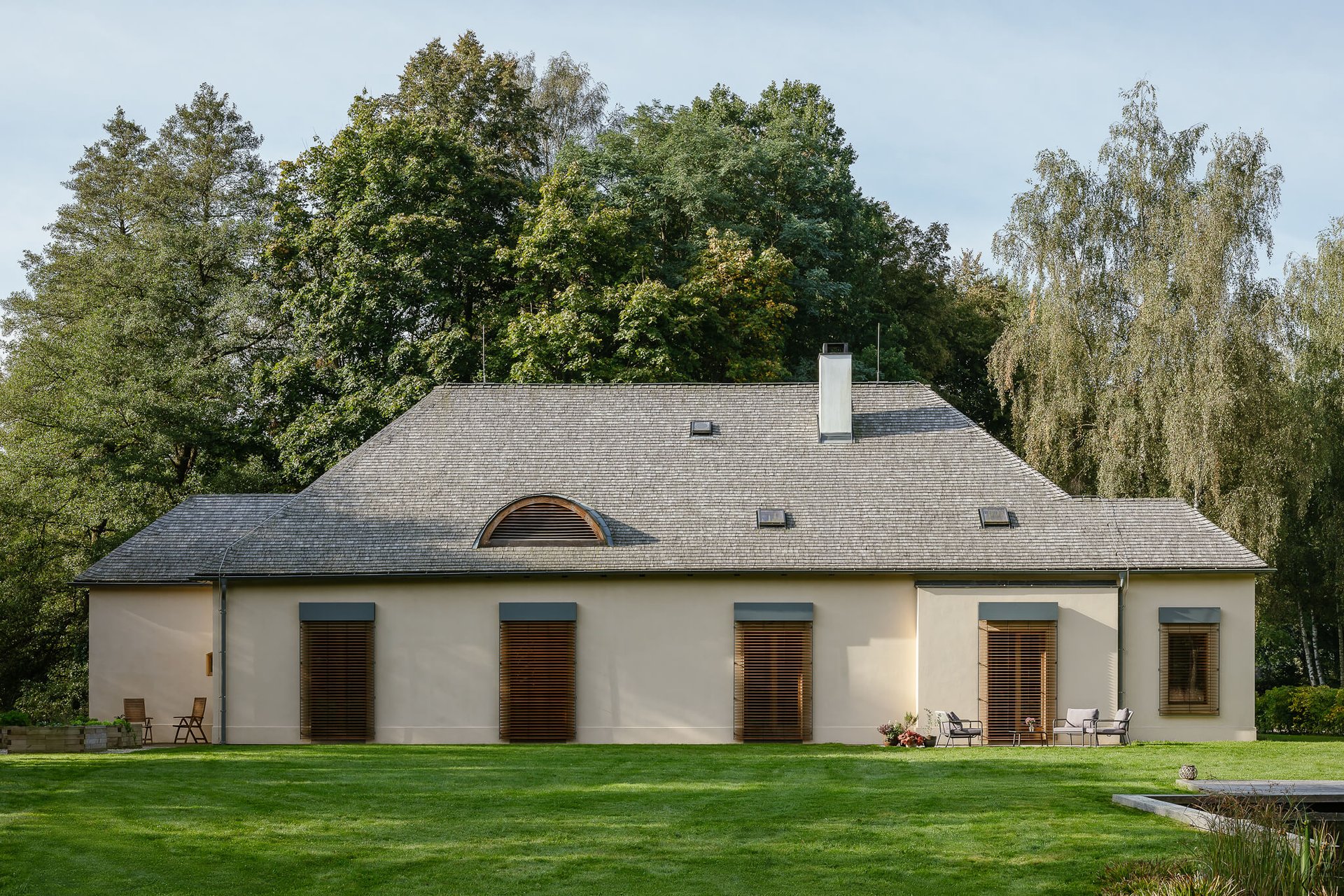 „Protože byl pro majitele vzniklý koncept příliš finančně náročný, museli jsme opustit koncept vnější repliky historické stavby. Projekt se tak vrátil zpět na začátek, nicméně navázal na některé již zrealizované části hrubé stavby, například posunuté části vnitřních nosných stěn nebo doplnění čelních rizalitů malými přístavky. Zásadní finanční úsporu přineslo rozhodnutí zachovat krov z roku 1948. To znamenalo nutnost akceptovat podobu domu, které dominuje mohutná a jen málo členitá střecha. A právě ta ‒ s citlivě navrženými detaily komínů a vikýřů ‒ byla podstatou prapůvodní barokní tváře stavby. Postupné obrábění historických vrstev domu společně s přísadou spletitého příběhu rekonstrukce a investorových přání a plánů dalo vzniknout zcela nové svébytné podobě letohrádku. Podobě, která vše integruje do jednoho homogenního celku.“