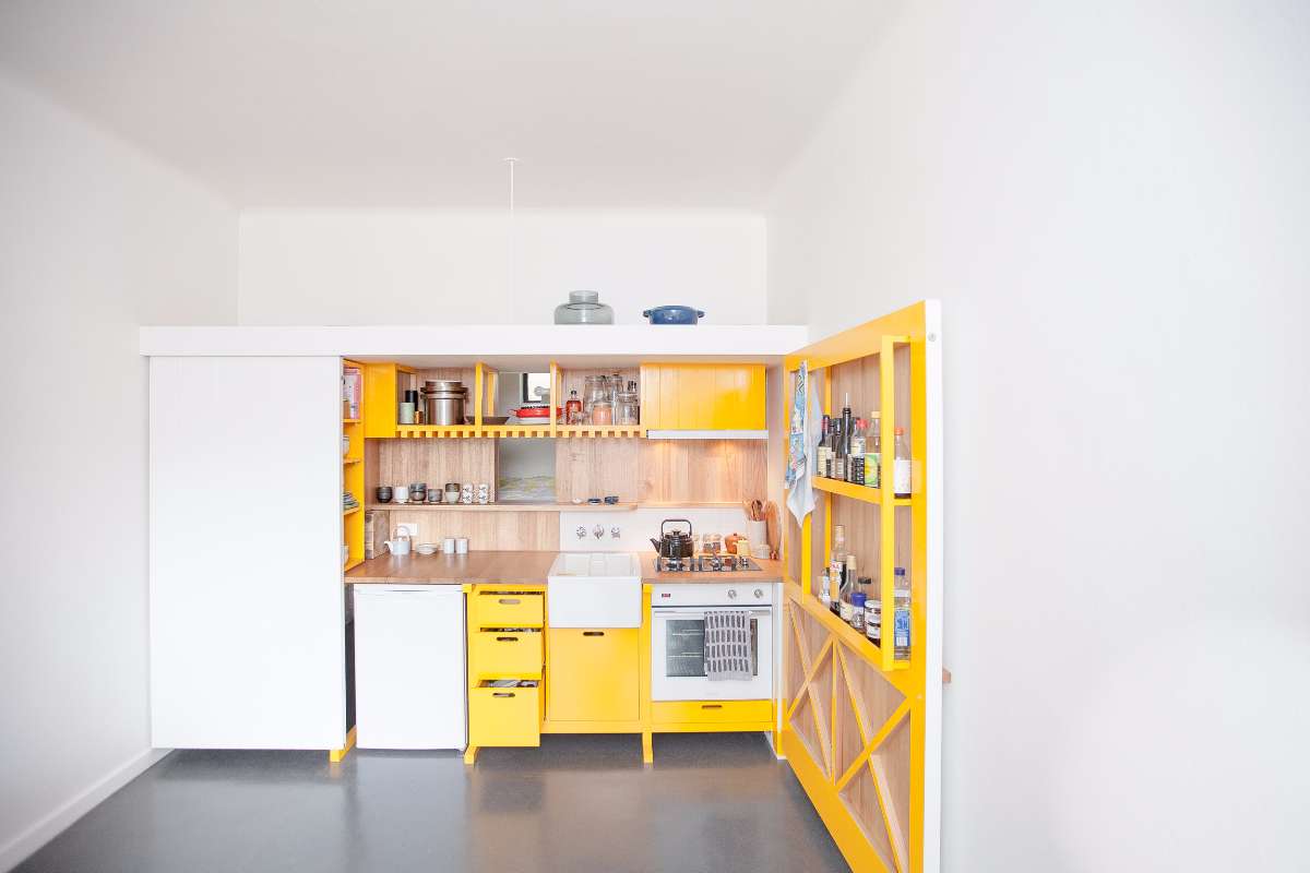 Celý systém je navržen jako zavírací kabinet, z jehož dveří se po otevření stanou další části kuchyňské linky, konkrétně dva boxy s úložnými policemi, jeden hluboký na potraviny a nádobí, a jeden mělký na drobnější kuchyňské doplňky. Čím je prostor menší, tím důležitější je organizace – proto má každá lahev s octem i každý nůž sevé jasně dané místo. Z druhé strany hlubokého boxu je navíc zabudována knihovnička, protože v koutu za kuchyňským blokem se nachází malá ložnice. Když si přeje Nicholas mít úplný klid, stačí mu vytáhnout box (tím se v ložnici zavře) a sáhnout po knížce.