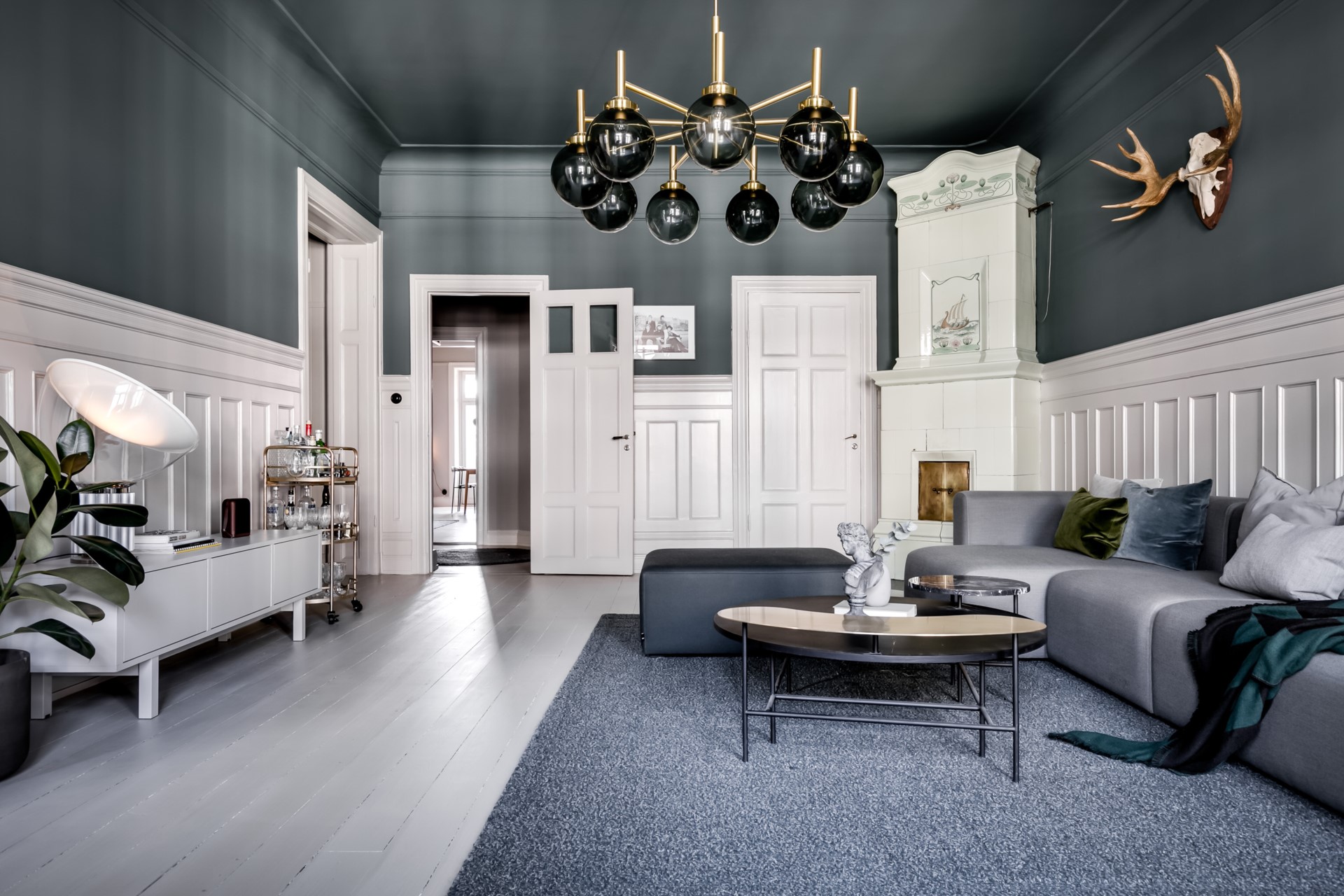 Na ploše 117 m² najdeme 4 a půl pokoje. Vejdete do příjemné uvítací haly, kde je šatna a vstup do koupelny. Okna obývacího pokoje směřují do ulice a místnost je po většinu dne zalitá sluncem. Jeho absolutní dominantou jsou ale nádherná kachlová kamna. Kuchyň je vcelku skromná a víc než samotná linka vaši pozornost strhnou krásná dobová okna a skladovací prostory šikovně schované za dřevěnými obklady. Kuchyň se nese ve světle šedých tónech s mosaznými detaily. Pracovní deska i obklad nad ní je z tmavě šedého mramoru. Z kuchyně vejdete do jídelny s prostorným stolem, jídelní lavicí a ani zde nechybí dobová kachlová kamna. Z jídelny je možné vejít na balkon s příjemným posezením.