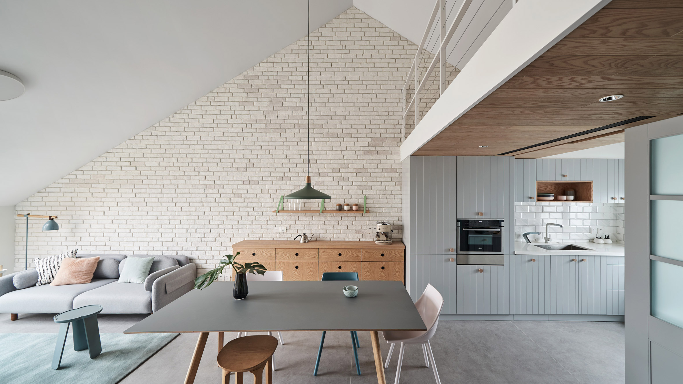 Podkrovní byt na okraji Pekingu má sto metrů čtverečních a patří mladému páru s jedním malým dítětem. Oba rodiče pracují často z domova a proto chtěli mít ve velkém, otevřeném prostoru, v němž budou strávit čas co nejvíce spolu jako rodina, také místo pro klidnou pracovnu, kde se budou naopak moci co nejvíce soustředit. Podkroví má dost vysoké stropy, a tak architekti ze studia HAO Design navrhli rozdělit jej do dvou úrovní – spodní patro slouží jako společenský prostor, vestavba v horní části je potom klidovou zónou, v níž najdete ložnici, koupelnu a pracovnu.