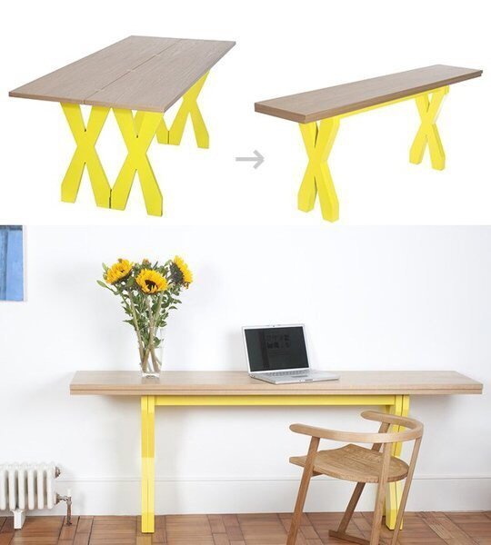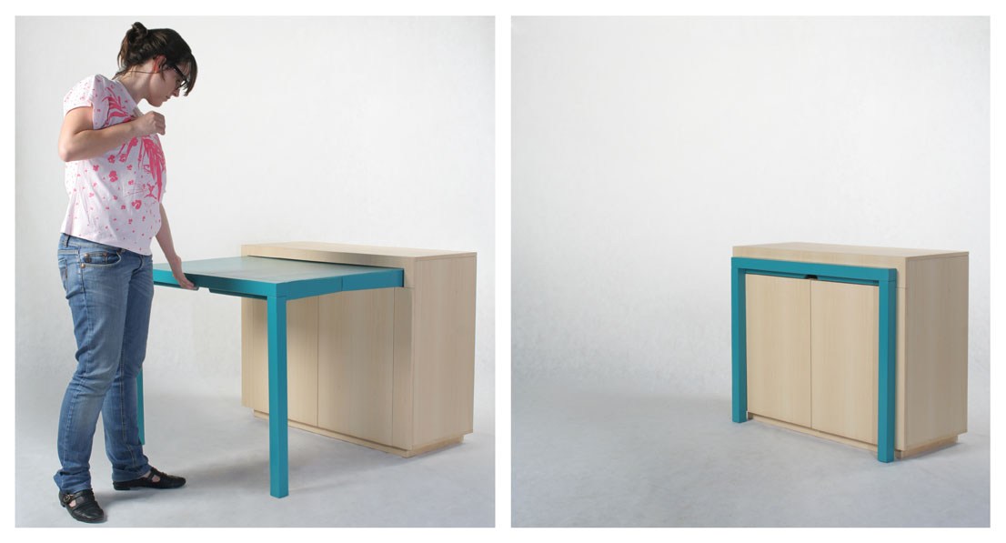 Úzký psací stolek se snadno rozloží v pohodlný jídelní stůl pro celou rodinu, stačí pár pohybů. Foto: Steuartpadwick.com