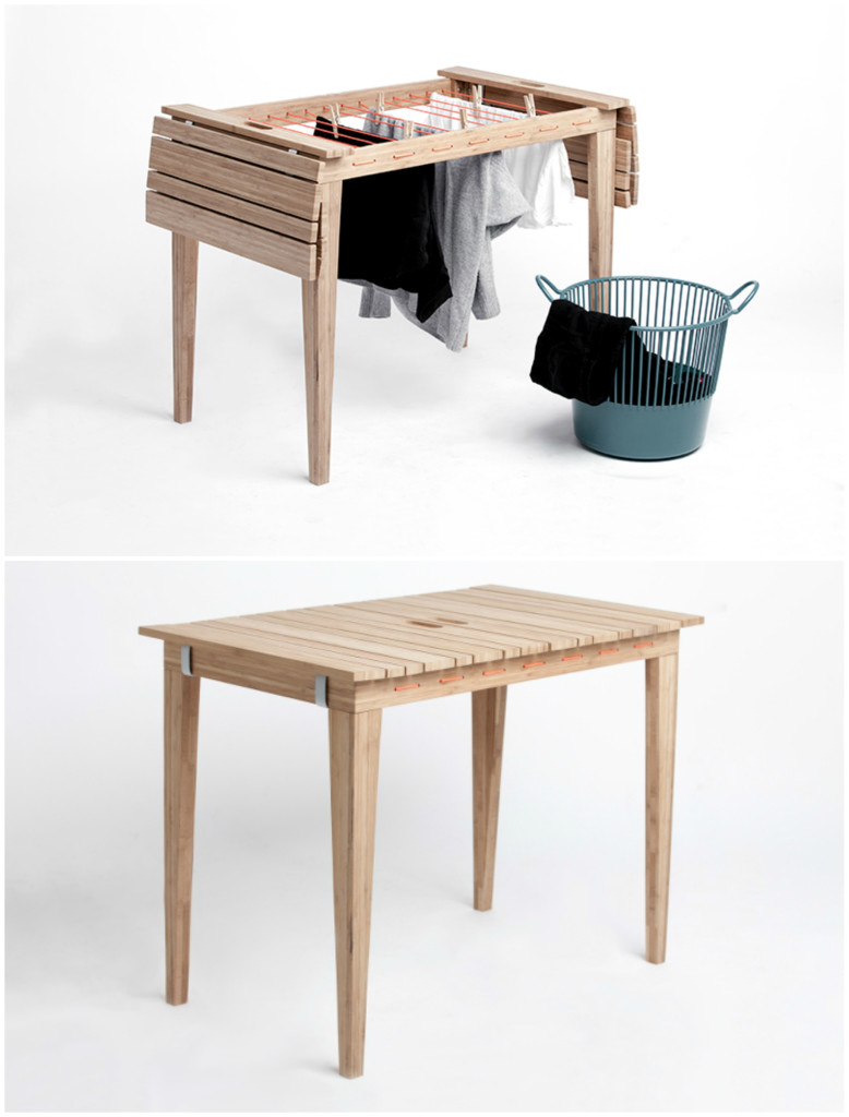 V malých bytech je sušení prádla problém, proto nás stolek Dryunder značky Nordvink nadchnul – je přímo geniální! Lamely jeho vrchní desky se dají odsunout stranou a pod nimi se skrývají šňůry na prádlo! Stůl je určený na balkony a odolá rozmarům počasí, ale využijete ho krásně i v bytě bez balkonu.