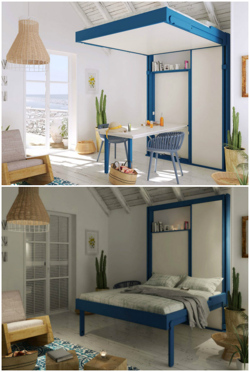 Ve dne postel skoro nepostřehnete, protože vypadá jako strop pracovního koutu. Večer ji ale stačí spustit k zemi a z domácí kanceláře se stává ložnice. Foto: Livinginashoebox.com