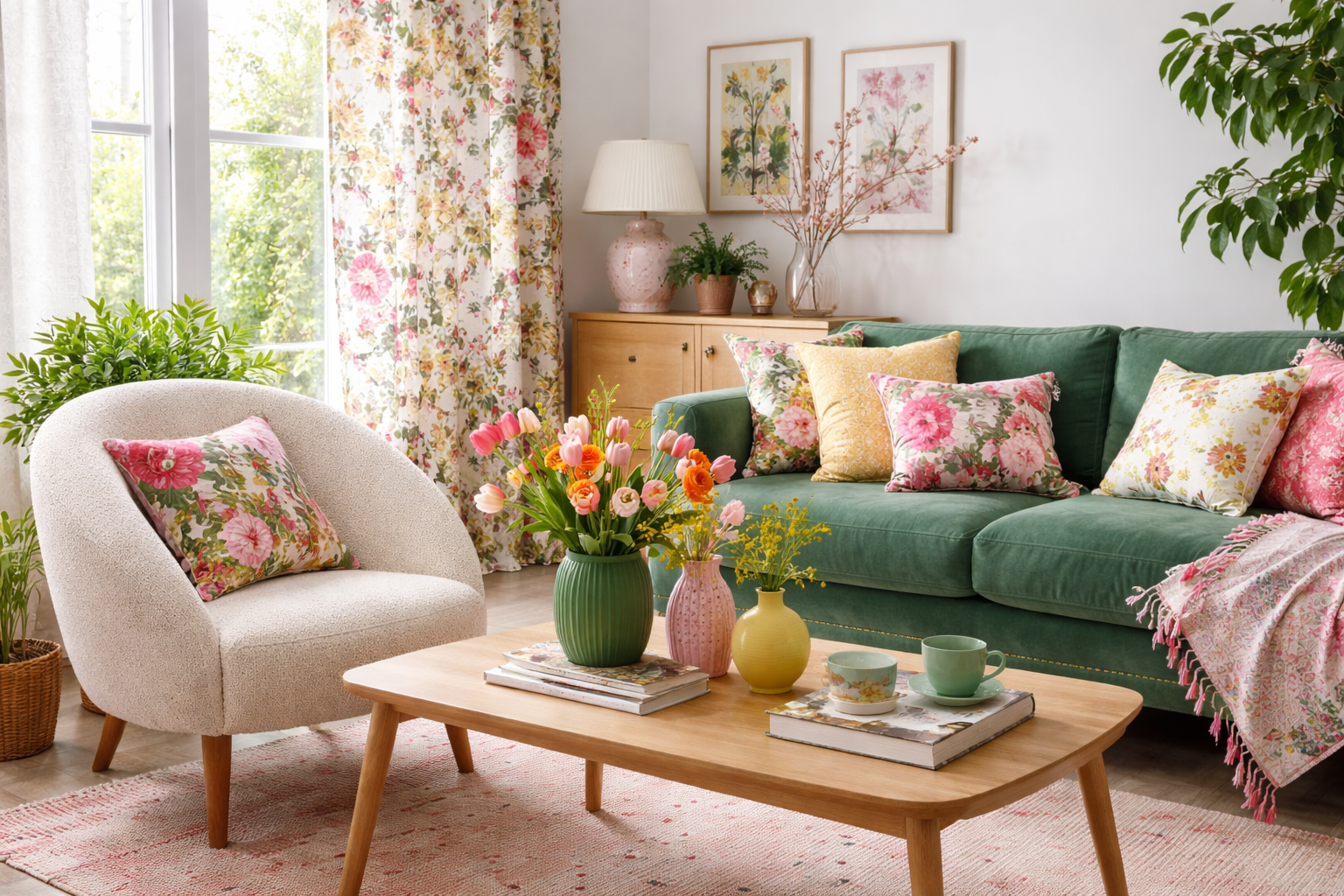 Základem je práce s barvou. Nemusíte zůstávat jen u světlých odstínů. Naopak, hlubší tóny dokážou prostor ukotvit a dodat mu charakter. Skvěle funguje tmavá zelená, kobaltová modrá nebo výraznější růžová. Květinové motivy pak fungují jako opak. Změkčují celek a působí v místnosti přirozeně. Přidávejte je postupně, na polštáře, přehozy nebo jen na křeslo. Uvidíte, jak bude vypadat celek a kdy si řeknete, že už to stačí. Někdy je to skutečně jen jeden kus nábytku s organickým vzorem, který změní místnost bez složitých zásahů. Důležité je držet rovnováhu. Pokud zvolíte výrazný vzor, nechte zbytek interiéru klidnější.
