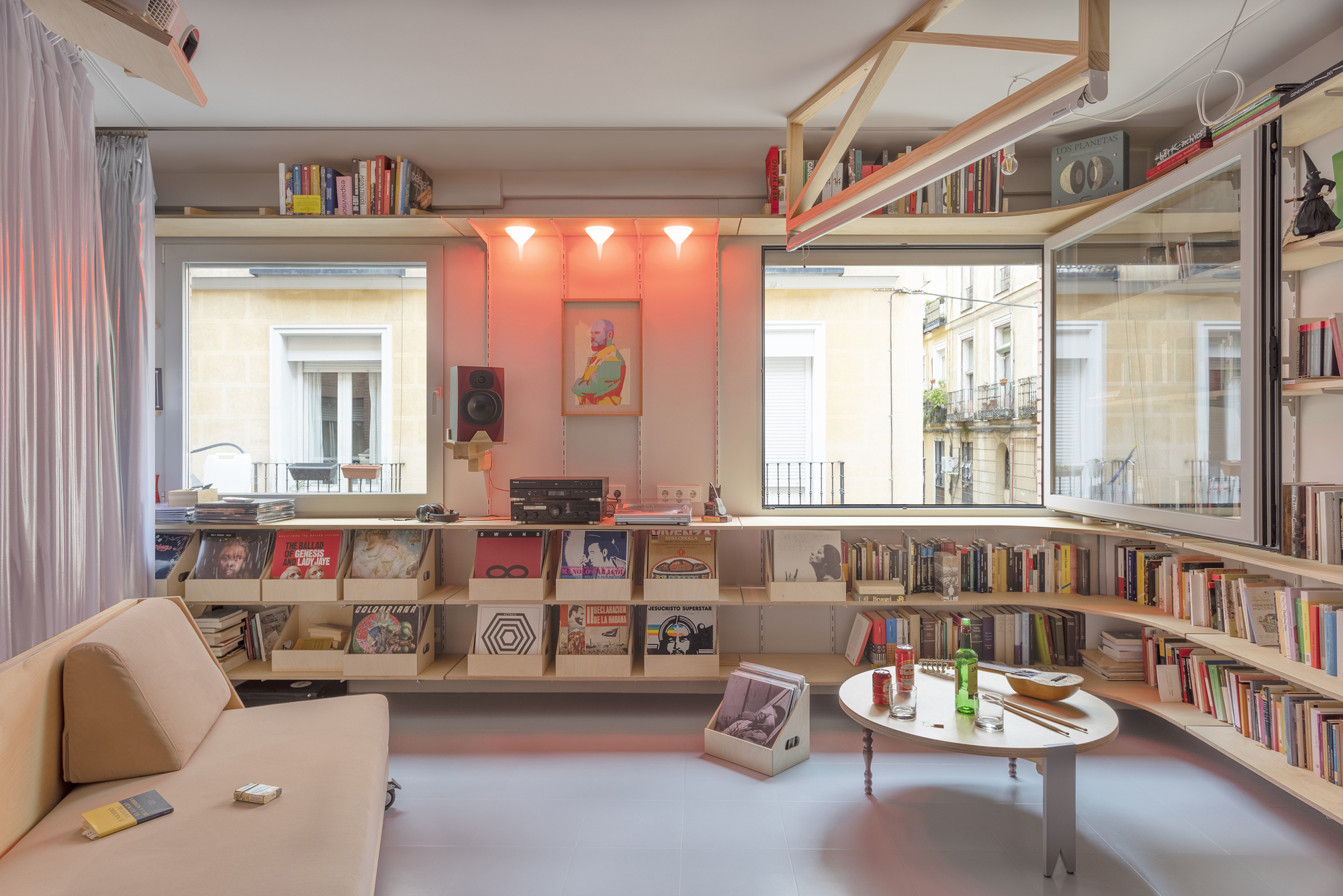 Architekti si pohráli s myšlenkou, kolik různých podob může mít takto malý interiér. Kromě možnosti měnit jeho vyznění pomocí závěsů, je kouzelníkem atmosféry systém osvětlení. Několik typů svítidel bylo vytvořeno pomocí běžných předmětů v domácnosti, jako jsou odkapávače mopů, sítka, trychtýře anebo citrusové odšťavňovače různých barev. Světla jdou zapínat nezávisle na sobě a jejich intenzitu ovlivňuje také umístění závěsů. Posledním trikem, jak udělat garsonku maximálně variabilní, je použití pohyblivého nábytku. Stůl na kolečkách s nohama ze starého vyřazeného nábytku, slouží buď jako jídelní nebo pracovní stůl. Pohovku lze přesouvat z jednoho místa na druhé a po přestavbě polštářů se dá použít jako lenoška na čtení. Televizní plátno lze snížit nebo zvednout až ke stropu, sledovat filmy je možné ze sedačky, postele nebo od jídelního stolu. Interiér se tak může proměňovat podle aktuální potřeby. „Architektura nabízí systém možností a záleží pouze na majitelích, jak žijí svůj každodenní život a na základě toho se rozhodnou interiér zařídit. Dům či byt nabízí pouze platformu pro další tvoření k absolutní spokojenosti obyvatel,“ vysvětlují architekti.