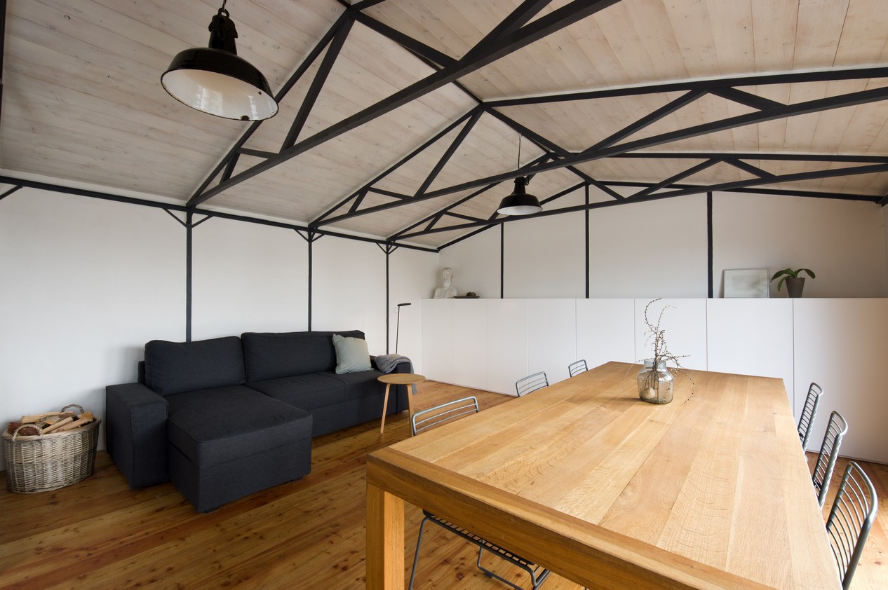 Celý prostor je laděn v odstínech bílé a šedé. Celkově byl interiér ve stavebním detailu pojat přísně minimalisticky, příkladem je absence soklů u dlažeb, parapetních desek u oken, obkladu stěny kuchyňské linky, závěsů, záclon apod. V tomto minimalistickém duchu byla vybrána i svítidla, v podstatě v celém objektu jsou použity 3 druhy svítidel a tím dostává interiér kompaktní a minimalistický charakter. Součástí rekonstrukce a dostavby chaty je i rekonstrukce samostatné stavby původní dílny, která byla přestavěna na společenskou místnost a pracovnu. Základní výtvarný prvek této rekonstrukce je původní ocelová repasovaná konstrukce. Podlaha je zde z modřínu, lakované skříňka a jídelní stůl byly vyrobený na míru. Strop je mezi vazníky obložen modřínem natřeným bílým mořidlem v severském stylu. Topí se v norských litinových kamnech na dřevo. Industriální osvětlení pochází z 30.let. Celkově se podařilo vytvořit velmi pohodlný a funkční prostor o rozměrech bytu, s dostatkem úložných prostor a krásnými výhledy do okolního lesa a zahrady. Přestavěná bývalá dílna navíc umožňuje oddělit společenský život od soukromého prostoru majitelů v bývalé chatičce.
