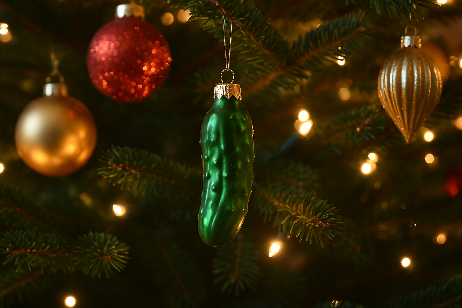Původ vánoční okurky je zahalen tajemstvím a koluje o něm několik barvitých legend. Žádná z nich není spolehlivě doložená, ale všechny skvěle dokreslují její folklorní kouzlo. Nejpravděpodobnější a zároveň nejprozaičtější vysvětlení nás zavede do 80. let 19. století. Tehdy začal americký obchodní řetězec F. W. Woolworth dovážet z Německa nádherné skleněné ozdoby ve tvaru ovoce, ořechů a zeleniny. Mezi nimi byly i okurky, o které ale zákazníci příliš velký zájem nejevili. Chytré obchodníky proto napadlo, že neprodejnému zboží pomohou jednoduchým marketingovým trikem. Začali šířit příběh, že schovaná okurka na stromečku je starou německou tradicí a její nálezce získá zvláštní odměnu. A legenda byla na světě. Další, mnohem dojemnější příběh vypráví o vojákovi bavorského původu jménem John C. Lower, který bojoval v americké občanské válce. Když byl zajat a uvězněn v drsných podmínkách, na Štědrý den umíral hlady. Údajně poprosil strážného o poslední jídlo nakládanou okurku. Ten se nad ním slitoval a jednu mu dal. Lower později věřil, že právě tato okurka mu dodala sílu přežít. Po návratu domů na památku této události začal každý rok na stromek věšet okurku pro štěstí.
