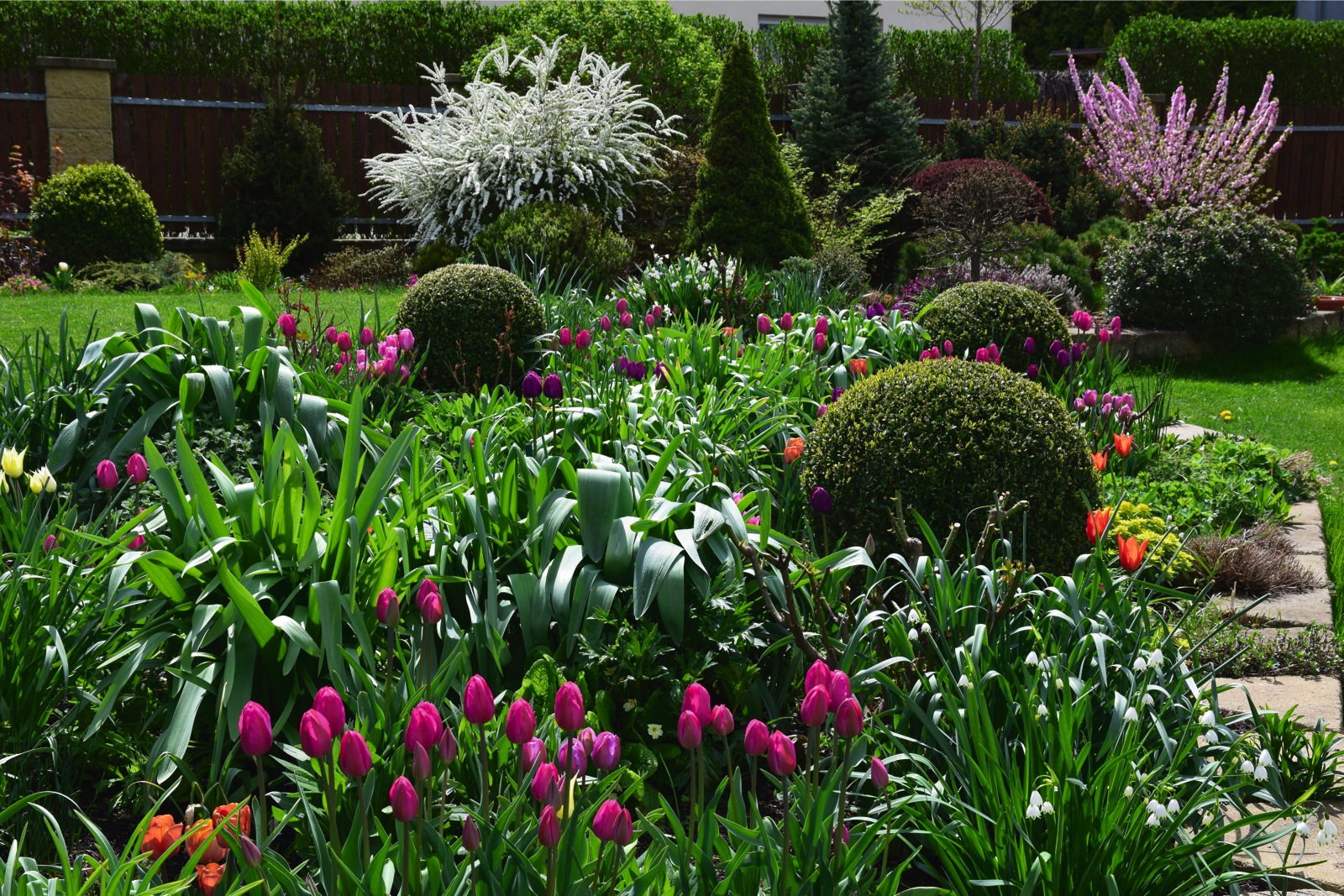 „Miluji, když se na zahradě objeví krokusy nebo růžový sníh padající ze sakury. Je to ten nejhezčí koberec na světě, líbí se i našemu synovi Hynkovi. Růžovou na zahradě doplňuje mandloň trojlaločná, která vztahuje ke slunci větve obalené květy. Ráda vytvářím sezonní kytice, ať už z vlastních výpěstků – na jaře třeba z čemeřic, modřenců, narcisků, tulipánů či hyacintů, v létě pak z růží a lučního kvítí –, nebo z pokladů posbíraných v přírodě, jako jsou třeba rozkvetlé větvičky trnky. Nechybí tu ani klidné místo s lavičkou z neošetřeného týku. Stejně jako Angličané, i Petra nechává dřevo přirozeně stárnout. Nalevo od lavičky se tyčí dřevěný obelisk. U nás v Čechách ho prý nesehnali, proto se výroby chopil Petřin manžel. Vzorem byla fotka, kterou pořídili v jednom britském zahradnictví. Teď se po něm pne hrachor a shora na vše dohlíží mohutná lípa. „Pro pocit soukromí jsme podél plotu vysázeli ovocné a jehličnaté stromy a okrasné keře. Na jaře se tu bílými kvítky pyšní tavolník a omamně voní fialové šeříky,“ říká Petra. Centrálnímu trvalkovému záhonu stejně jako celé zahradě vévodí růžovofialová barva. Řád i určité ohraničení dodávají záhonu kulatě zastříhávané buxusy. Právě ty jsou pro anglickou zahradu velmi typické.
