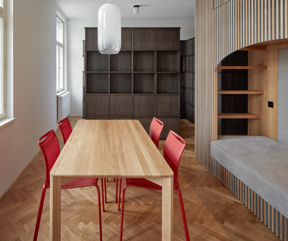 Zadáním projektu bylo vytvořit interiér na míru do minimálního bytu tak, aby se zde komfortně zabydlela čtyřčlenná rodina. Byt svým vlastníkům nemá sloužit jako bydlení trvalé, nýbrž víkendové. „Byt vznikl rozdělením původně větší jednotky, teď má necelých 37 metrů čtverečních. Na této rozloze developer navrhl dispozici 2+kk, což by znamenalo, že by se byt prakticky nedal zařídit a že obyvatelům by bylo souzeno pohybovat se v úzkých koridorech mezi nábytkem,“ vysvětlují situaci autoři projektu z ateliéru ORA (originální regionální architektura). „Investoři nás oslovili ještě v procesu výstavby a díky tomu jsme měli možnost do dispozice zasáhnout. Smazali jsme všechny nepotřebné příčky a vytvořili garsonku. Oddělaná zůstala jen koupelna. Do centra nové dispozice jsme umístili prostor. Obdélníkový prostor, se stolem a židlemi uprostřed. Posuneme-li však stůl a židle stohujeme na sebe, vzniká nám prostor dostatečně velký, aby se jeden mohl protáhnout. Tím jsme se vyvarovali pocitu stísněnosti. Možnost protažení těla jako měrná jednotka stísněnosti.“