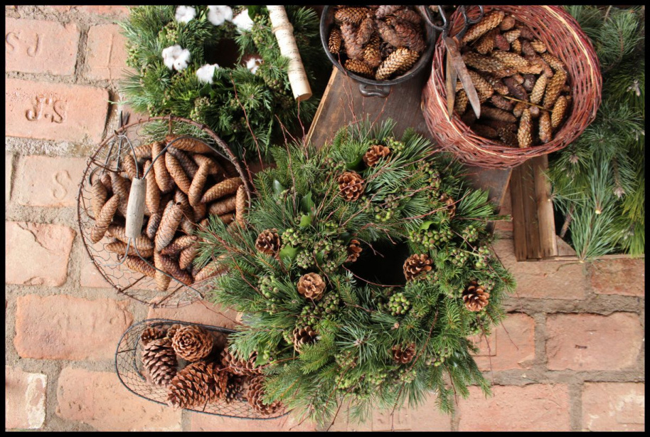První, co si nachystáme je materiál. „S ním to občas nemusí být tak jednoduché, navíc v případě, když chceme mít věnec pověšený doma v teple. Snad každý už někdy smetával opadané jehličí z adventních věnců. Pro věnce domů na stůl, krb či stěnu jsou vhodné všechny druhy tújí, normandské/kavkazské jedle a borovice,” radí Vašek, který vyrábí své věnce pod značkou Country Wreath Moravia. „Pokud bude věnec viset na venkovních dveřích můžeme bezpochyby sáhnout i po nejrůznějších druzích smrků. Ve venkovním chladném a vlhkém prostředí které naše zimní období nabízí, vydrží déle. Z listnatých keřů a stromů můžeme vybírat i z máhónií, cesmín nebo buxusů. Krásně vypadá taky břečťan, at’ už listy nebo zelené plody. Sáhnout můžeme také i po suchých květenstvích okrasných a lučních trav, rákosu, větvičkách, šípcích, záleží na vkusu každého z nás.”