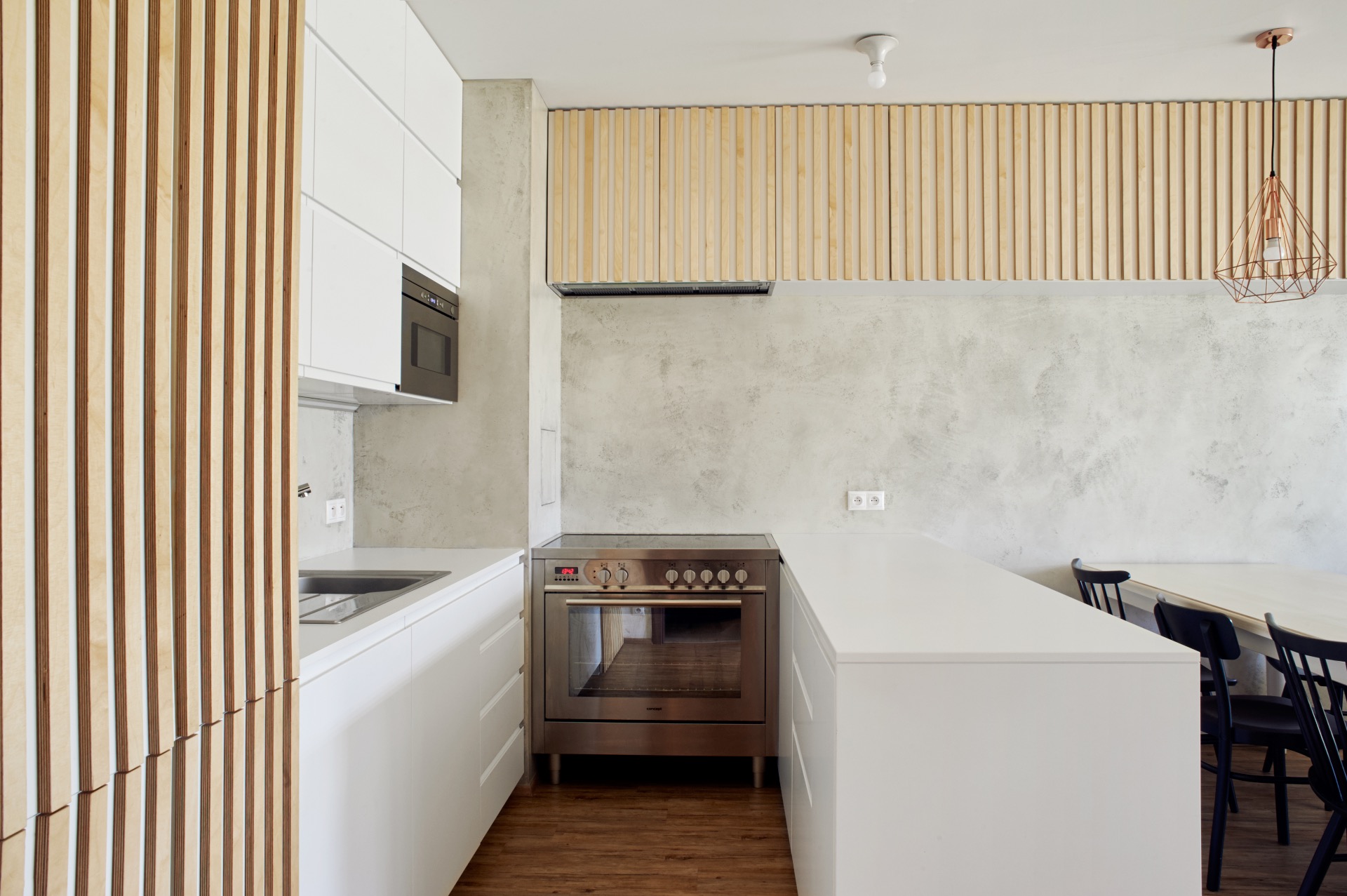 Neměnili ani podlahy, obklady a dlažby, dveře či sanitu, přesto interiér po zásahu architektů působí zcela jinak. „V rámci obývacího pokoje s kuchyní jsme narušili bílou utilitárnost mramorovým obkladem a betonovou stěrkou. Dominantním vizuálním prvkem celého interiéru se staly dřevěné laťky,“ popisuje změny Martin Machů. Latě funkčně rozdělují prostor, zároveň dodávají pocit kompaktnosti. Stejný motiv se objevuje v celém bytě. Svislé laťky najdeme na skříni u kuchyňské linky, nad jídelnou a sedací soupravou, kde se skrývají úložné prostory. V ložnici je z nich čelo postele a jsou také na úložných prostorech. Dětský pokoj nezůstává pozadu, protože mu dominuje výmalba, která vyobrazuje les.
